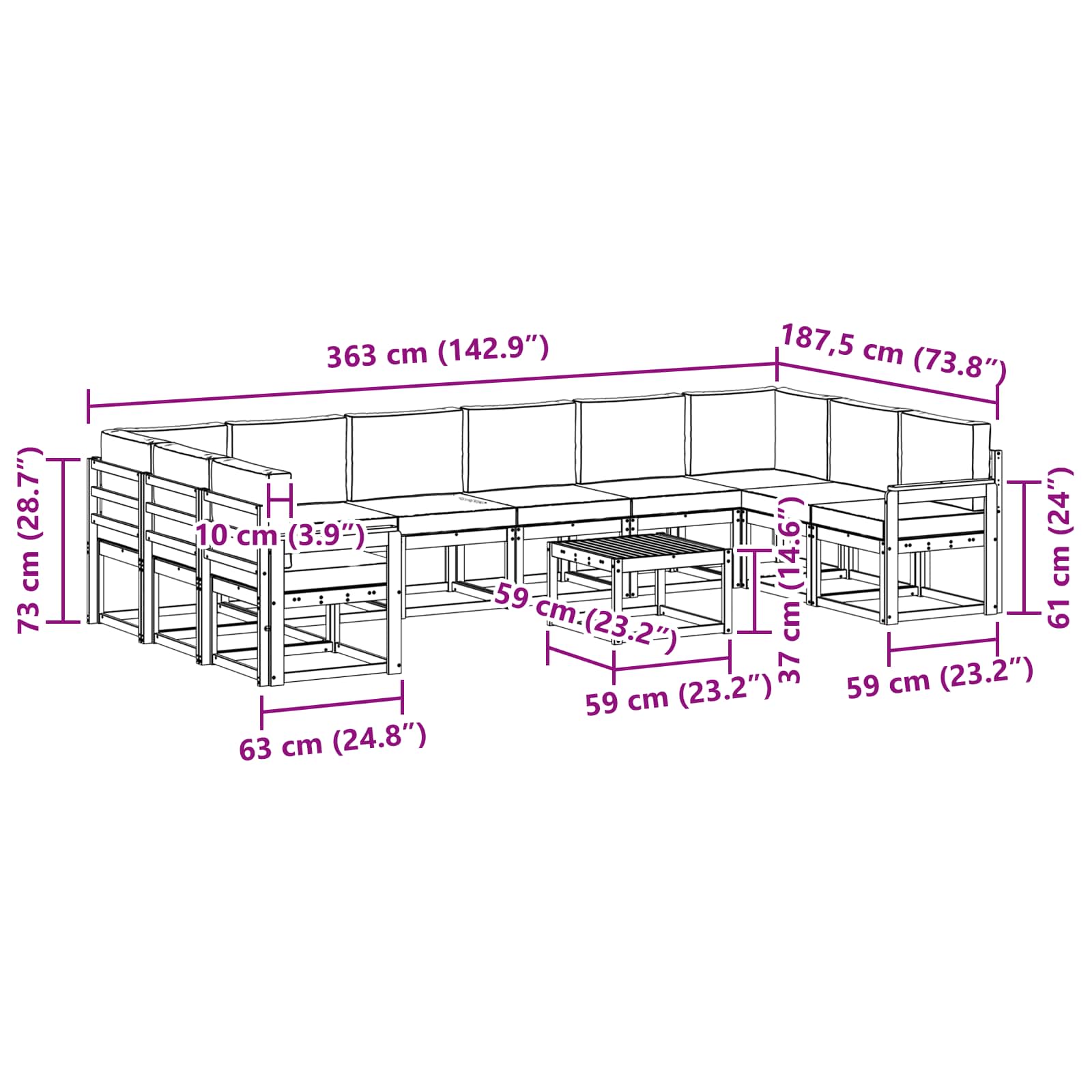 - 8 x Canapea Mijloc: 59 x 63 x 73 cm (L x l x h)