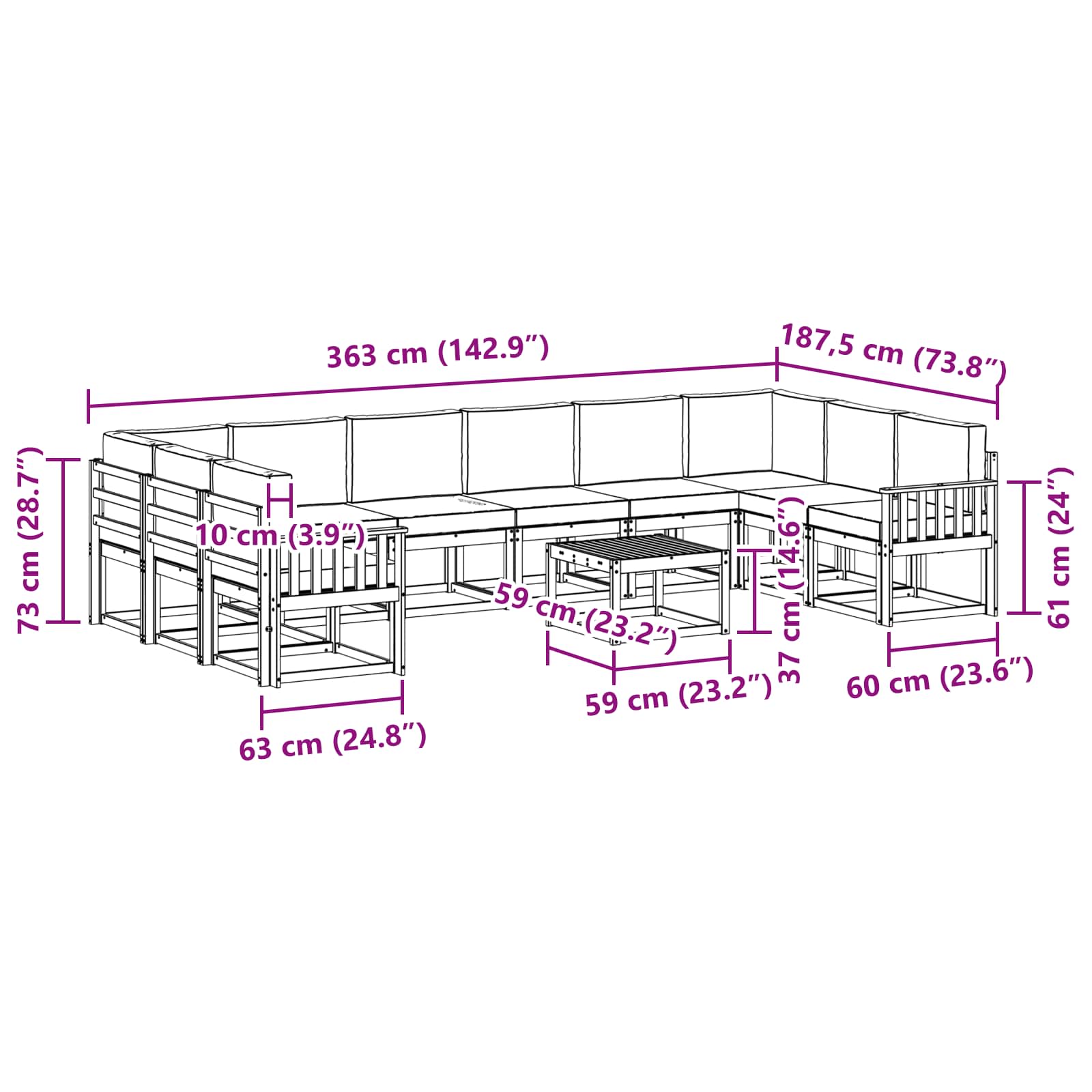 • 8 x Canapea Mijloc: 59 x 63 x 73 cm (L x l x h)