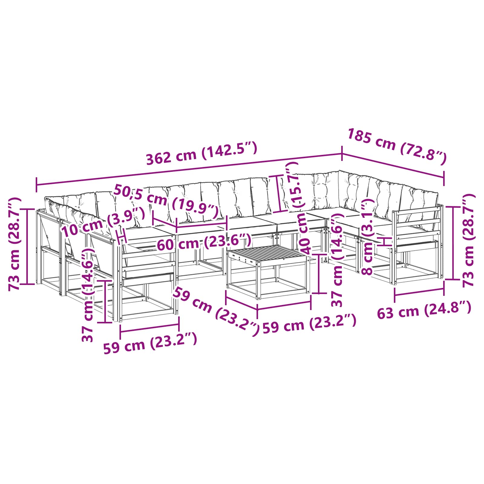 - 8 x Canapea Medie: 59 x 63 x 73 cm (L x l x h)
