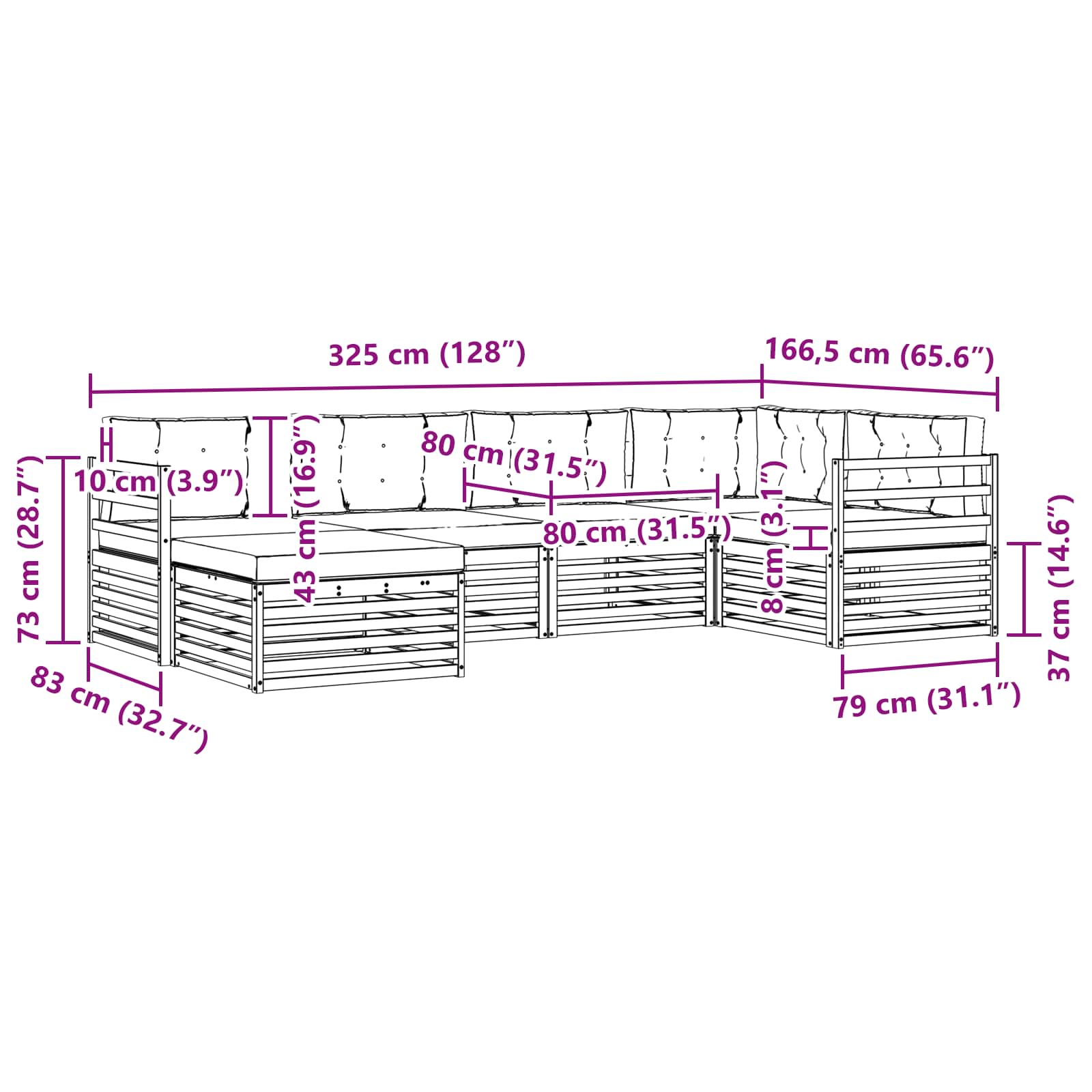 - 6 x Perne de șezut: 80 x 80 x 8 cm (LxWxH)