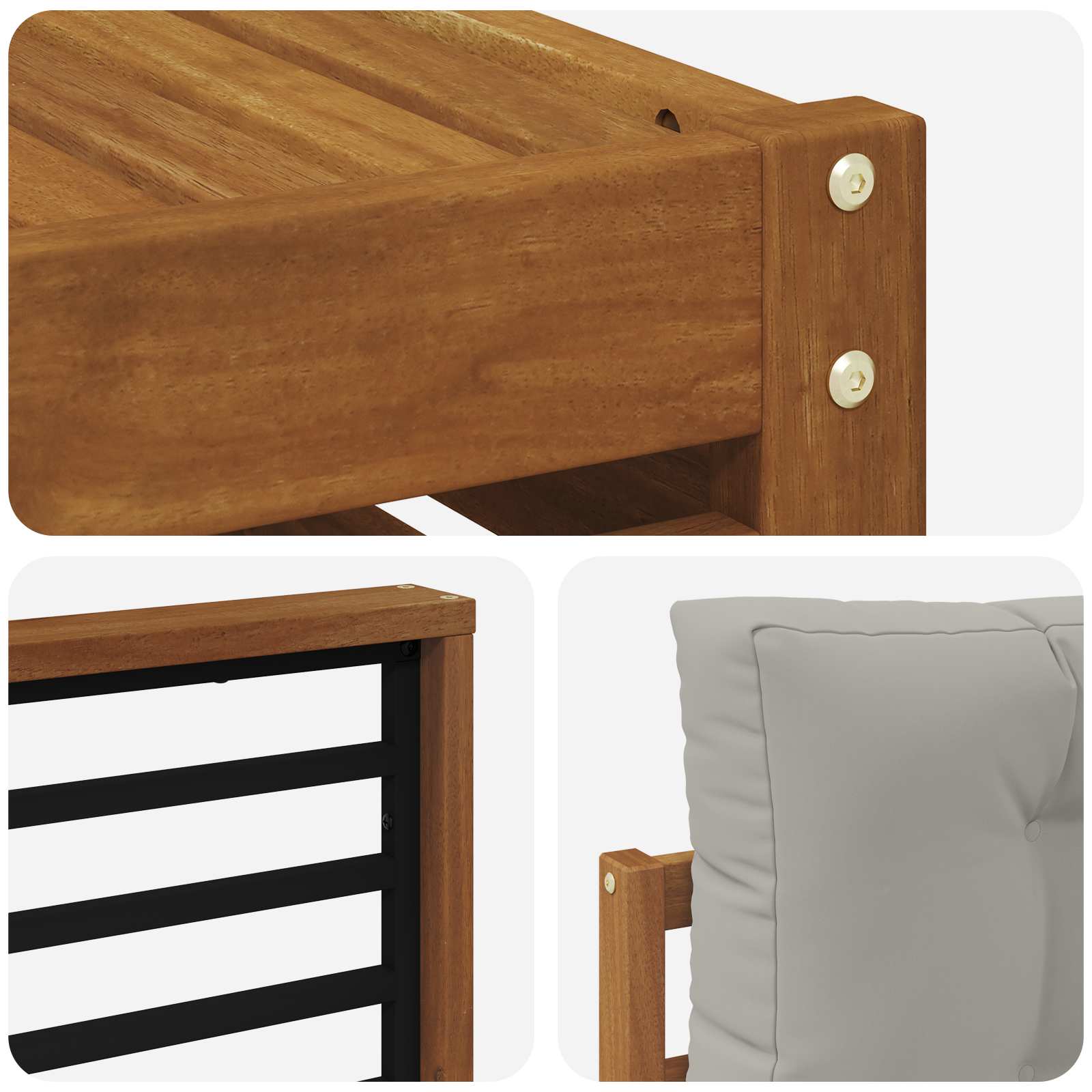 Setul de mobilier pentru exterior aduce împreună stilul și utilitatea, făcându-l un element de atracție pentru grădini sau terase. Designul modern, cu linii clare și detalii simple, adaugă un vibe elegant și susține momentele de relaxare în aer liber, precum și întâlnirile cu prietenii. Fabricat din lemn masiv de acacia, setul e durabil și arată grozav pe termen lung, fiind perfect pentru cei care caută atât practicitate, cât și stil în mobilierul de exterior.