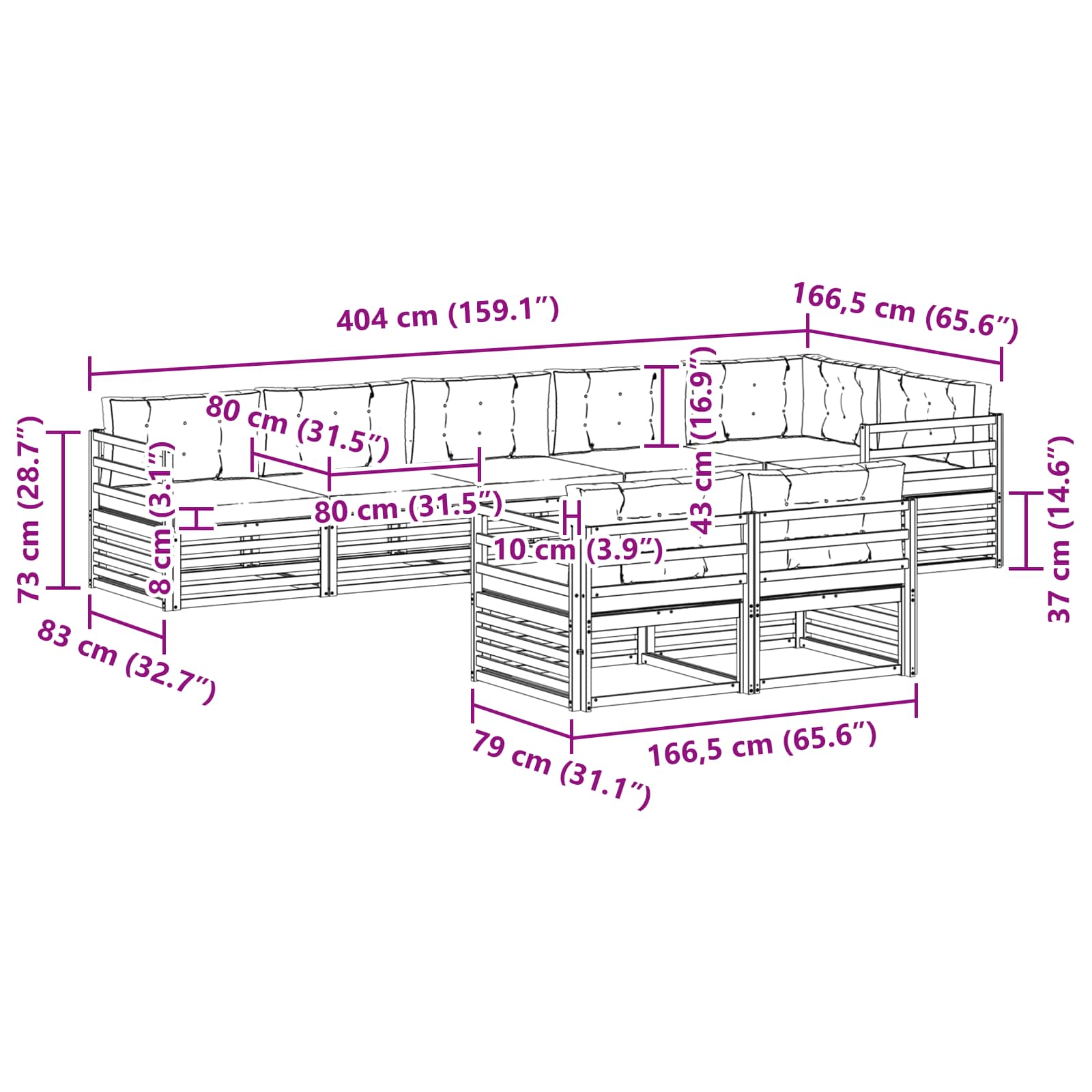 - Sofa de mijloc: 79 x 83 x 73 cm (L l x l x h)