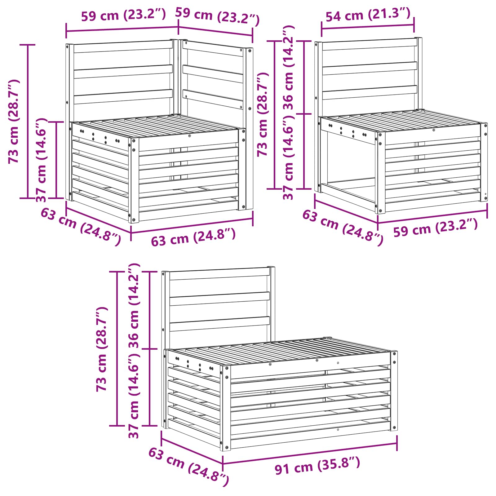 - 1 x canapea mijlocie: 59 x 63 x 73 cm (LxWxH)