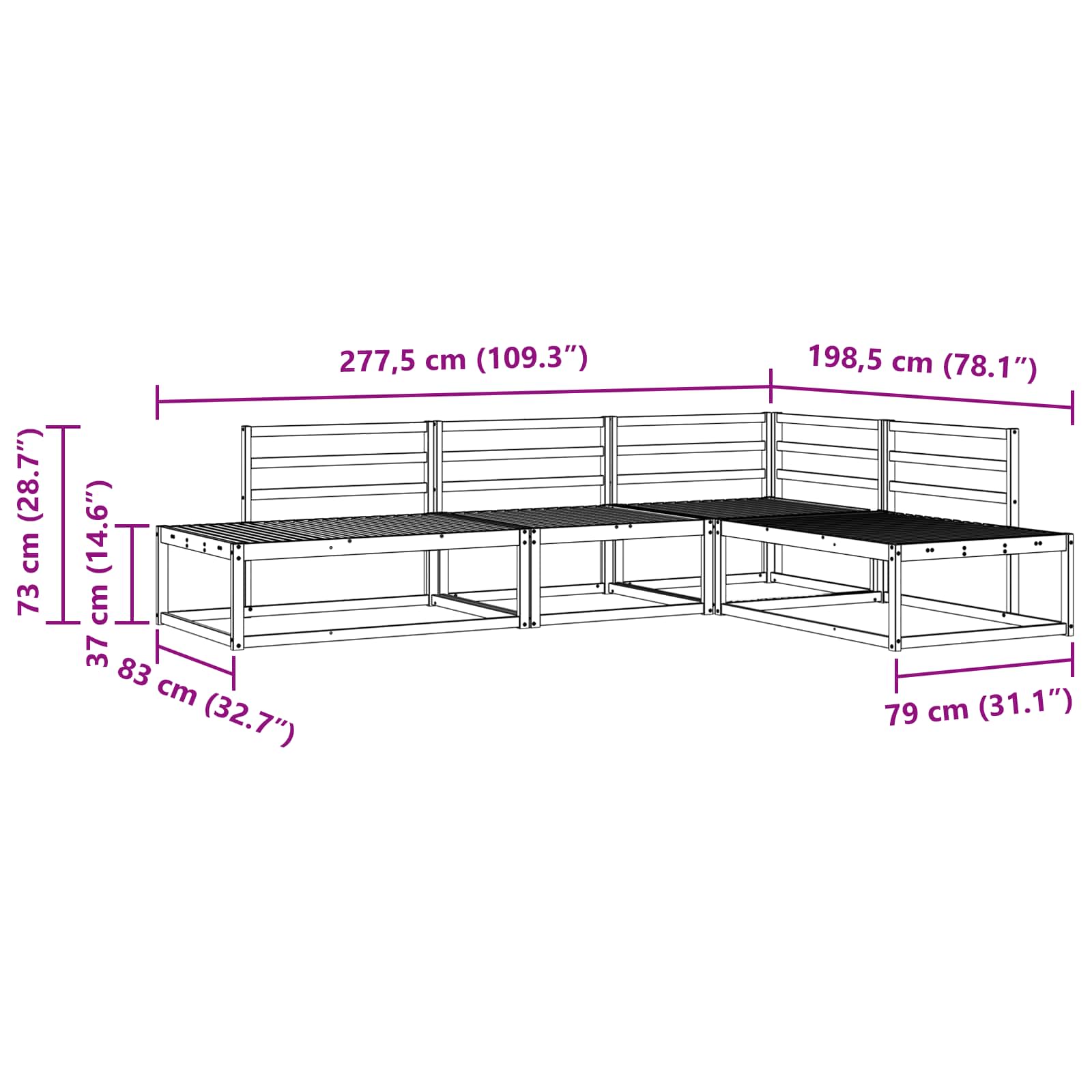 - Dimensiuni generale: 277,5 x 198,5 x 73 cm (L x l x î)