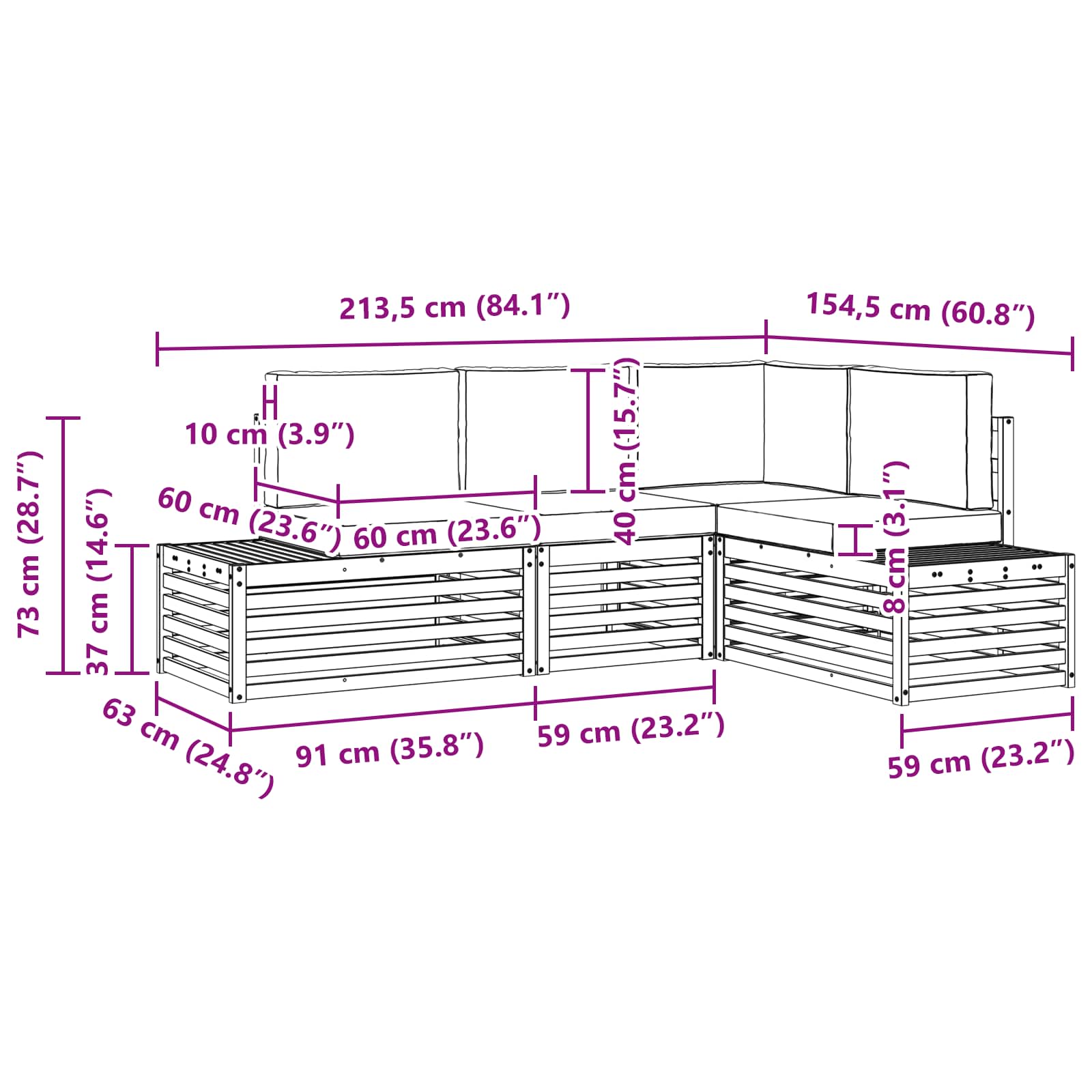 - 2 x canapea de capăt: 91 x 63 x 73 cm (LxWxH)
