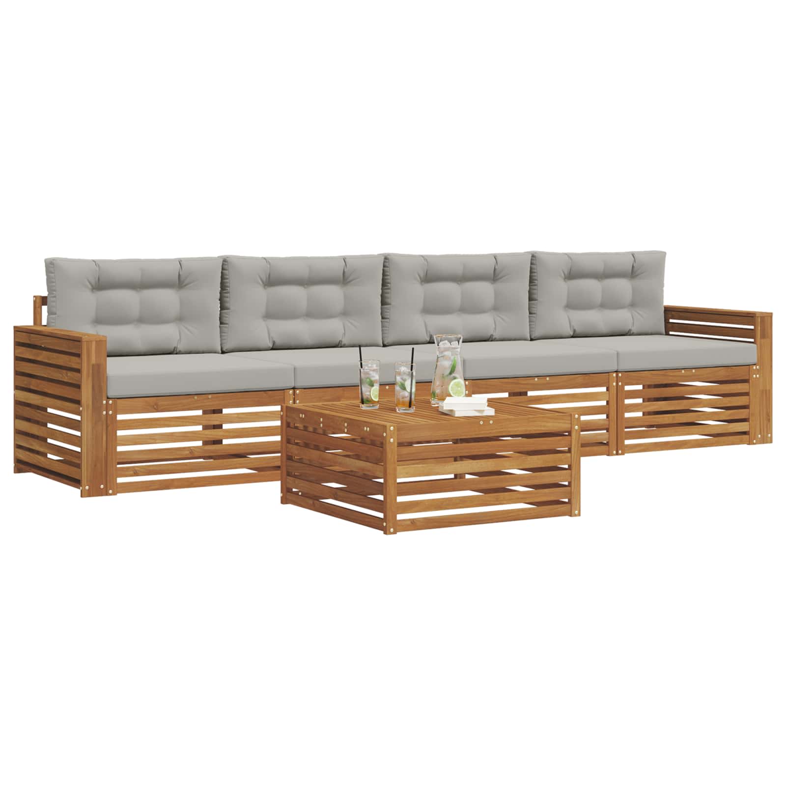 Setul de mobilier pentru exterior combină stilul cu funcționalitatea, devenind un punct de atracție pentru orice grădină sau terasă. Designul său modern, cu linii curate și detalii minime, adaugă eleganță și sprijină relaxarea în aer liber și întâlnirile cu prietenii. Fabricat din lemn masiv de acacia, setul e durabil și are un aspect vizual plăcut pe termen lung, fiind ideal pentru cei care vor atât utilitate, cât și un design atrăgător în exterior.