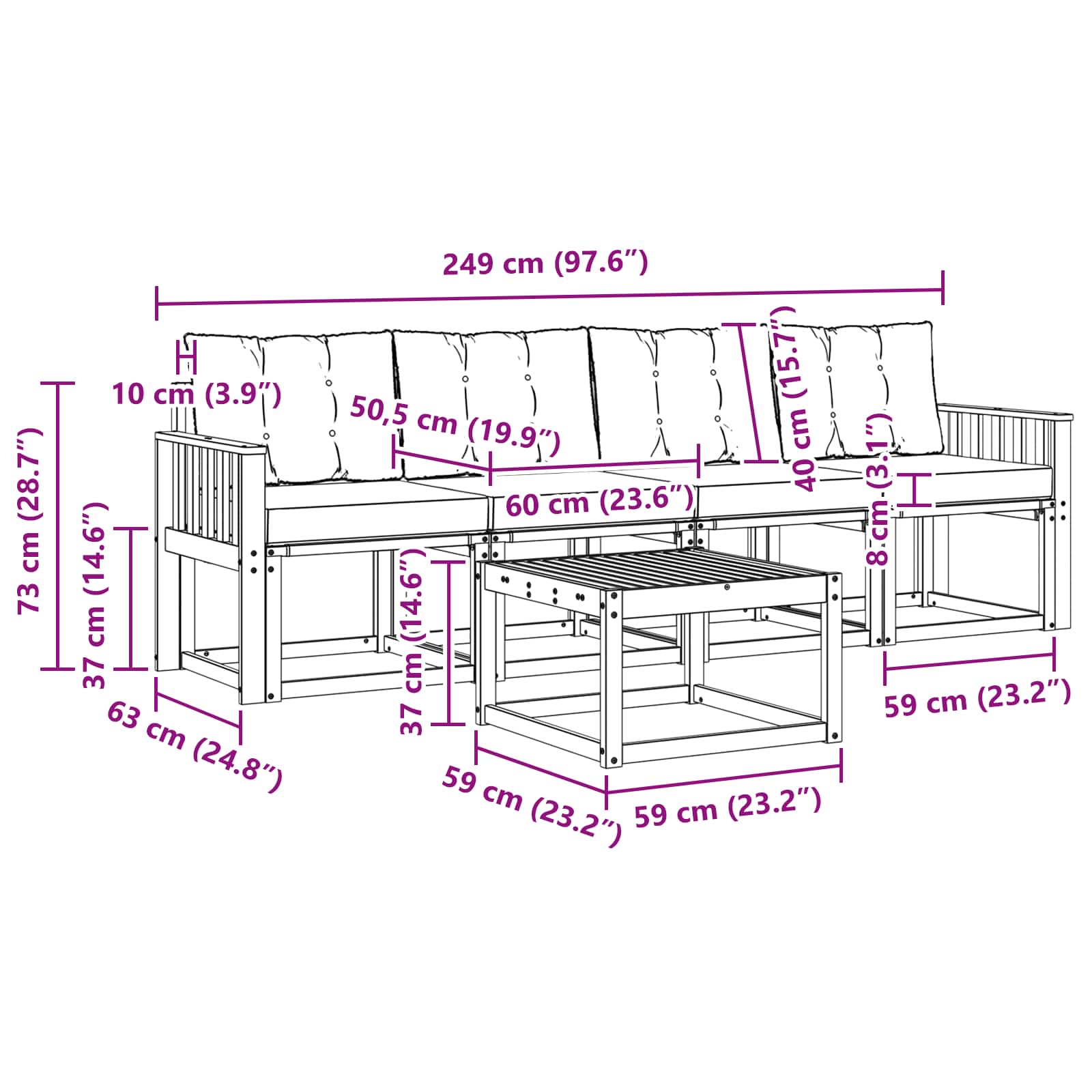- 4 x Canapea din mijloc: 59 x 63 x 73 cm (LxWxH)