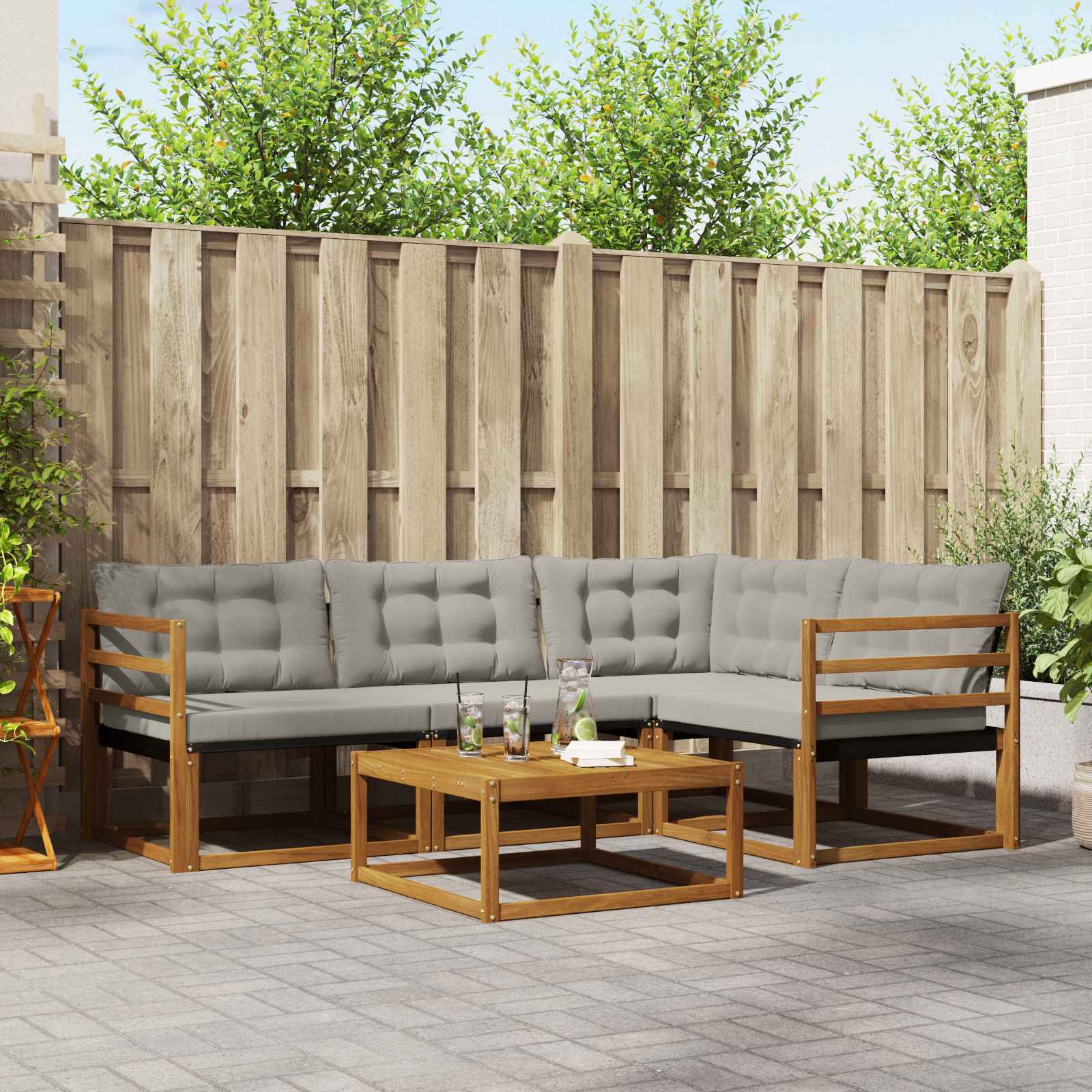 - Cadru din lemn de acacia: Setul are un cadru din lemn de acacia, cunoscut pentru rezistența și textura sa naturală care îmbunătățește decorul de afară. Nuanța bogată conferă un aspect cald, oferind totodată durabilitate.
