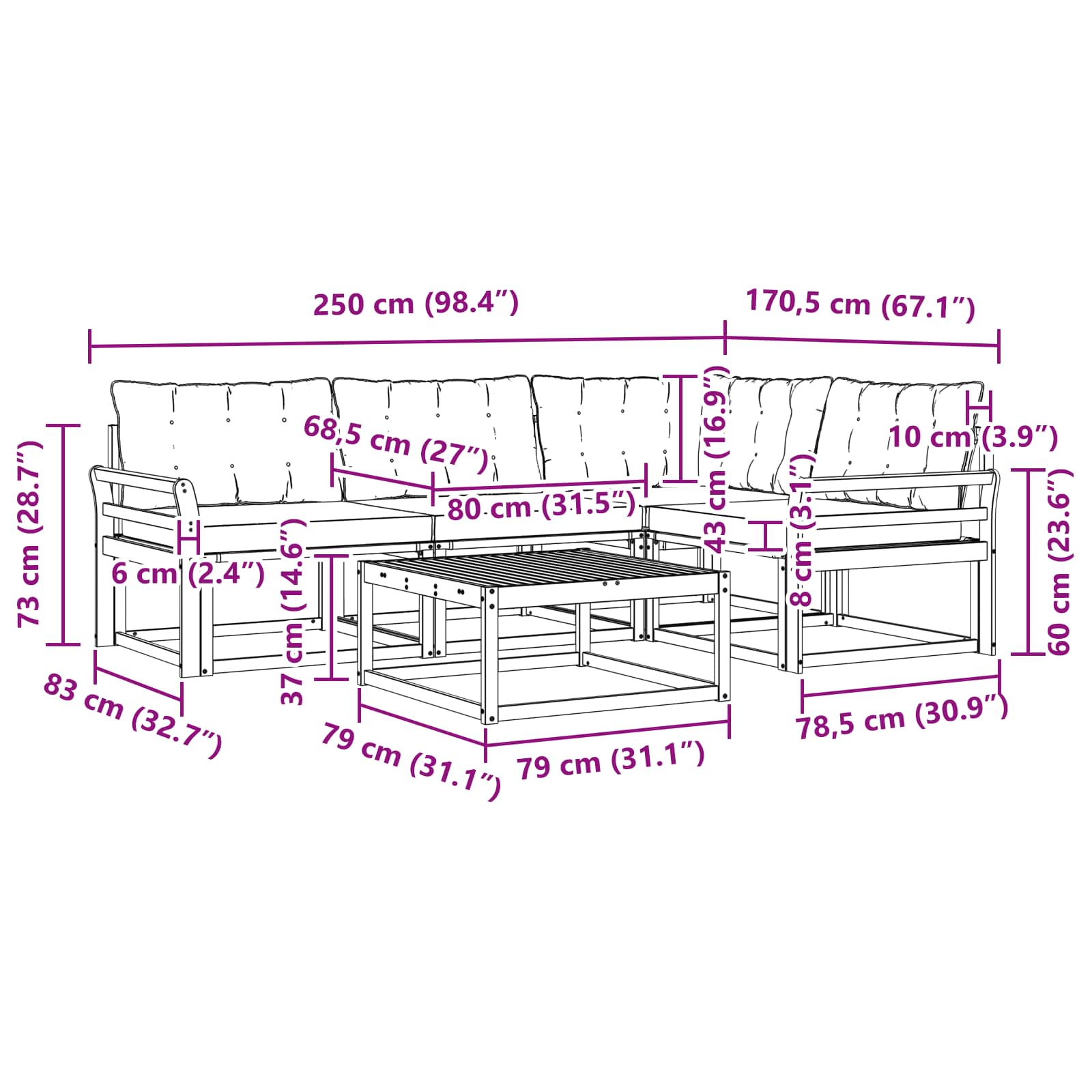 - 3 x Canapea din mijloc: 79 x 83 x 73 cm (Lxlxî)