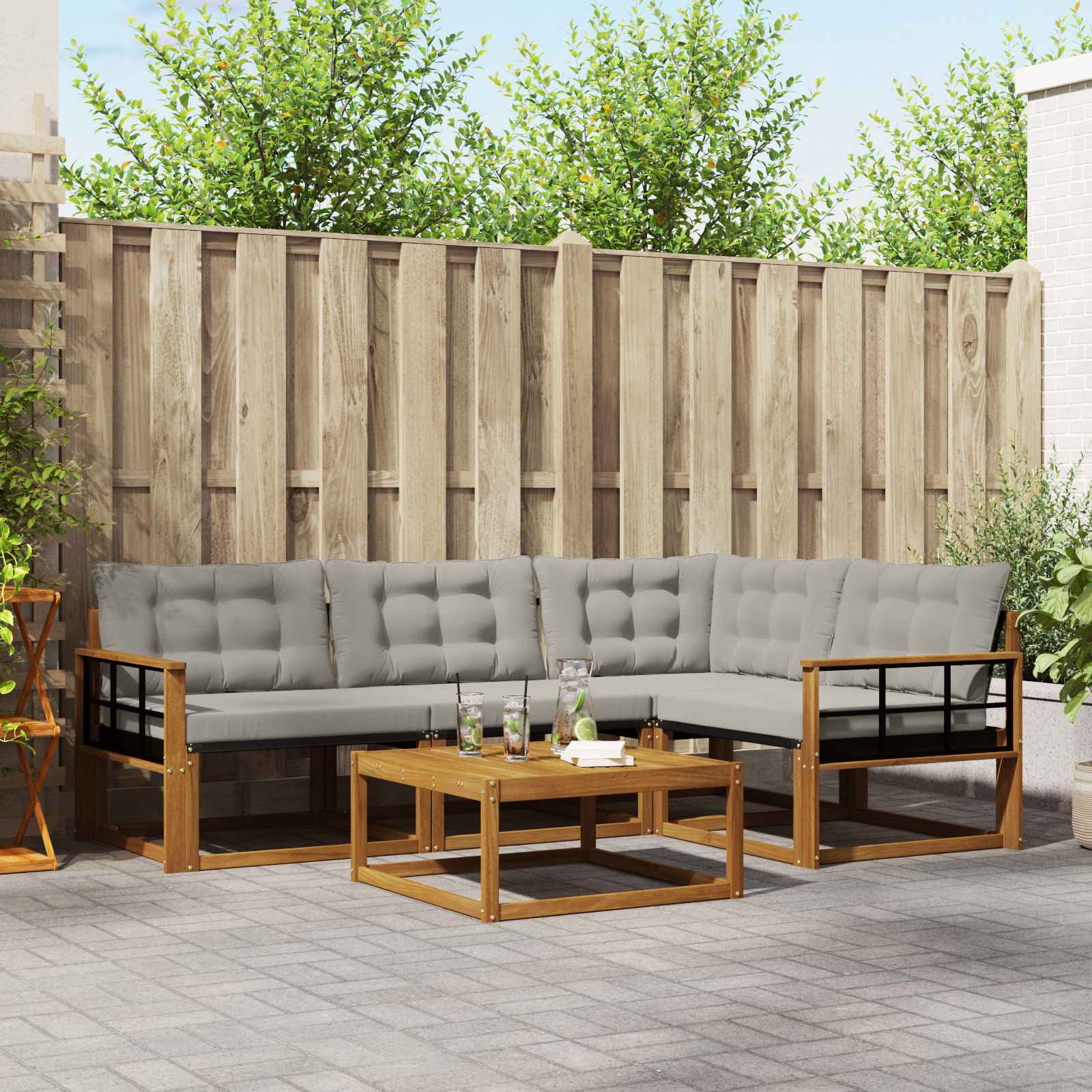 - Cadru din lemn de acacia: Setul are un cadru din lemn de acacia, cunoscut pentru rezistența și textura sa naturală care îmbunătățește decorul de afară. Nuanța bogată conferă un aspect cald, oferind totodată durabilitate.