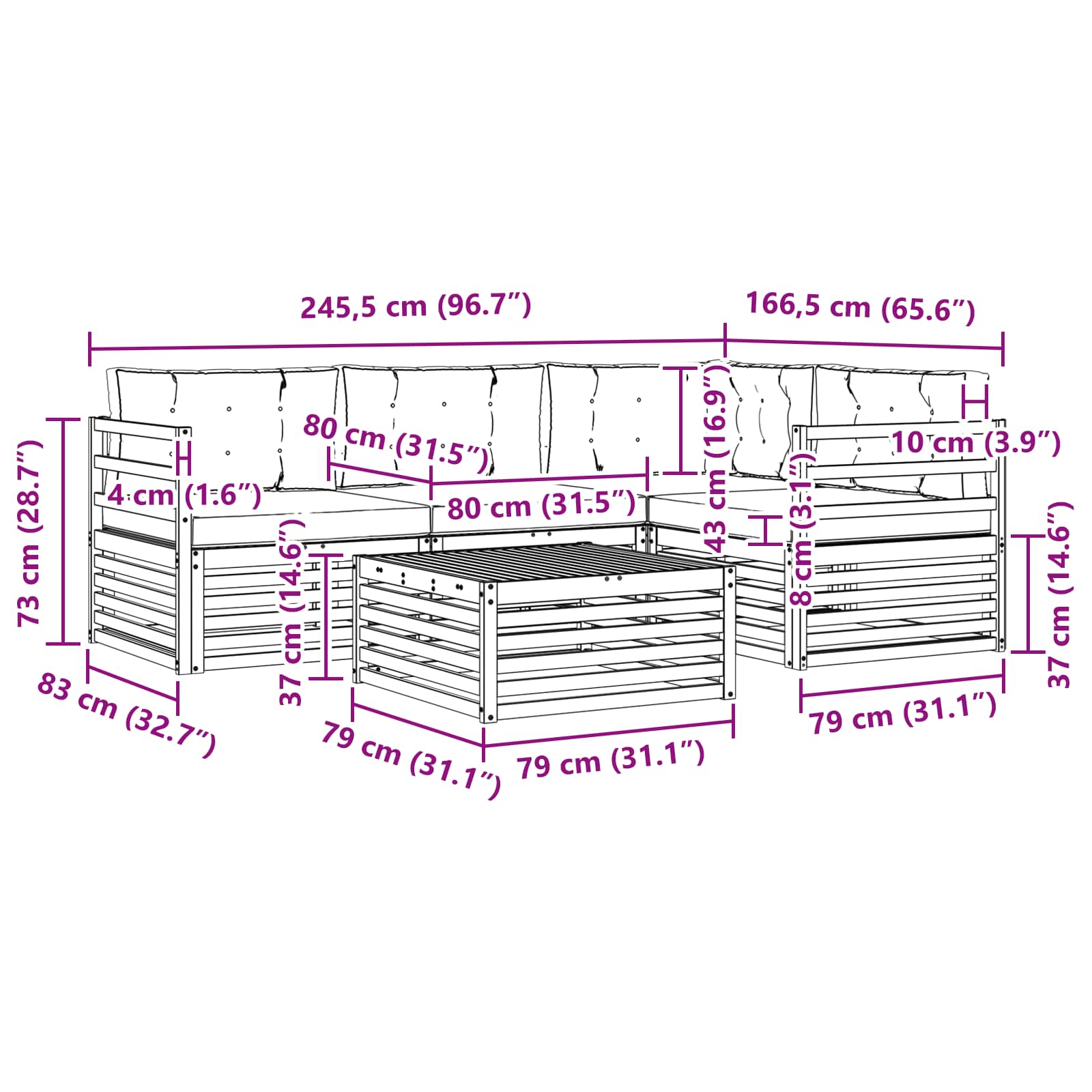 - 4 x Perne de șezut: 80 x 80 x 8 cm (LxWxH)