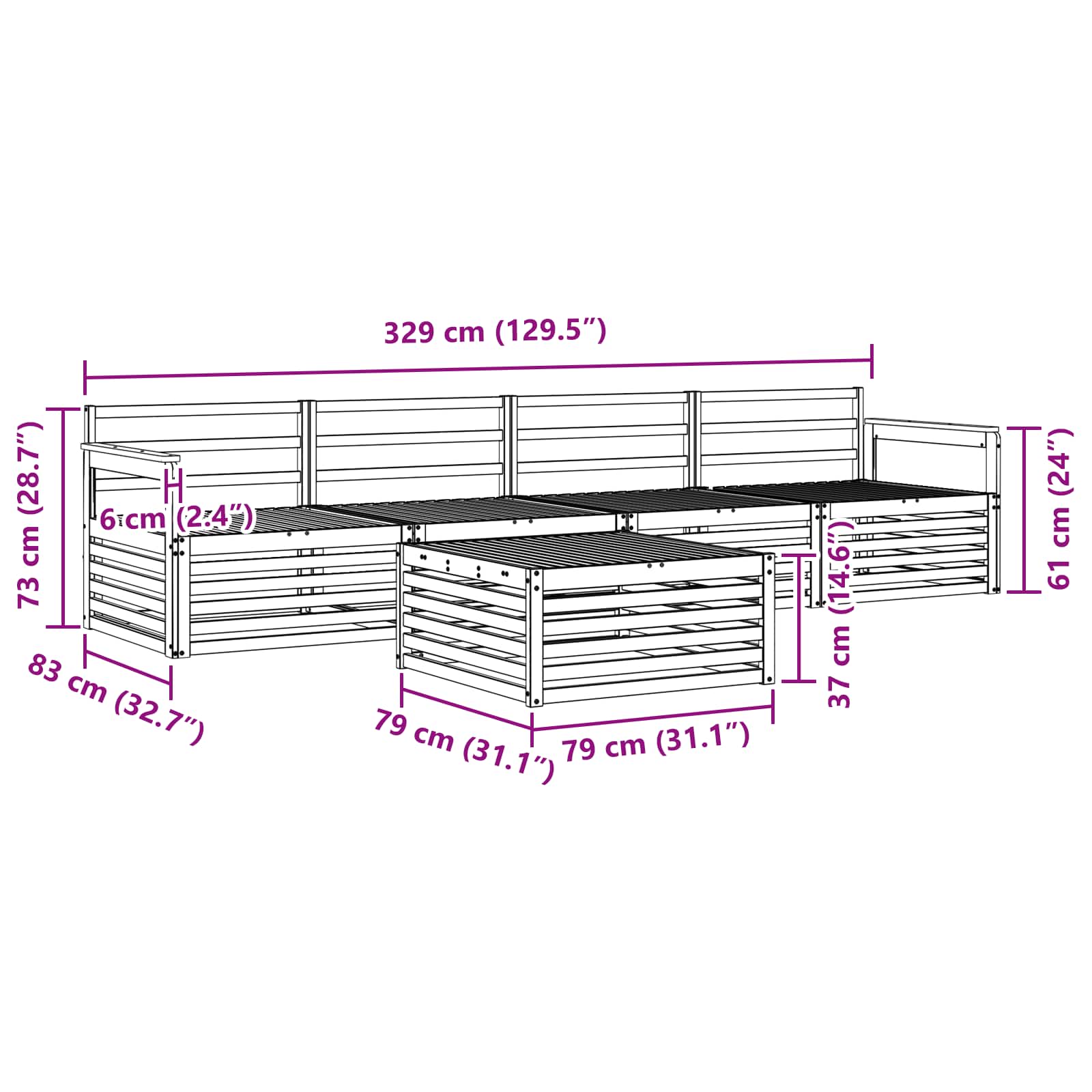 - 4 x Canapea de mijloc: 79 x 83 x 73 cm (LxWxH)