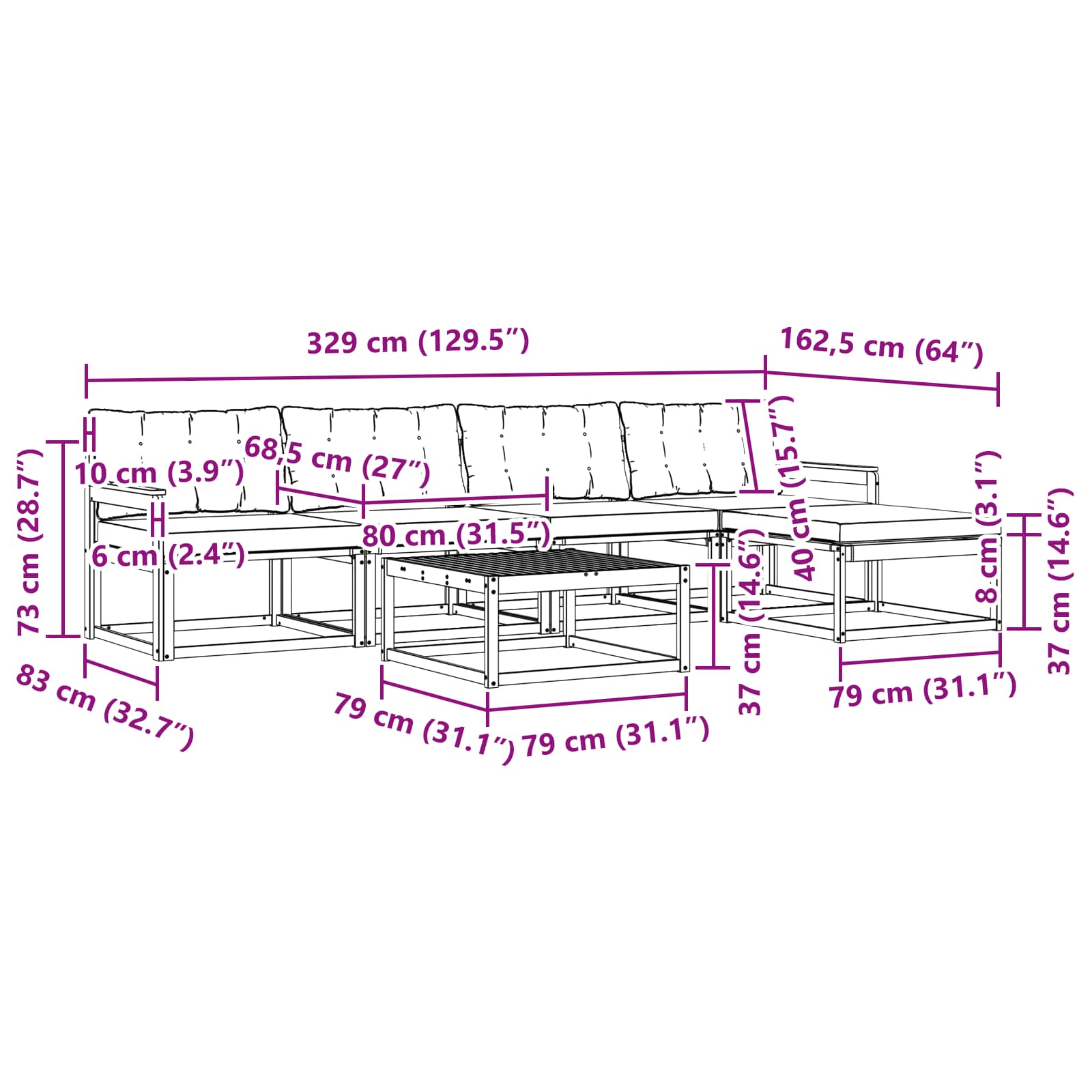 - 4 x Canapea Mediocră: 79 x 83 x 73 cm (LxWxH)