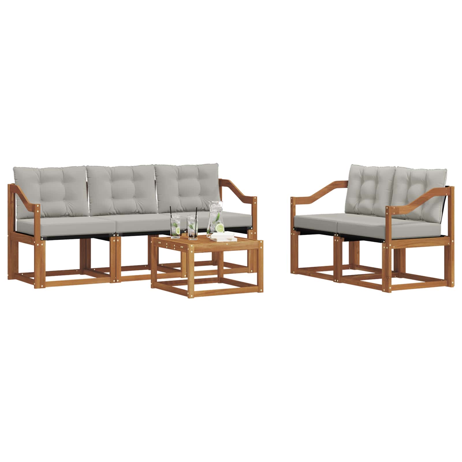 Setul de mobilier de exterior combină stilul cu funcționalitatea, fiind o piesă excelentă pentru orice grădină sau terasă. Cu un design modern, simplu și elegant, aduce un vibe relaxant pentru întâlniri sociale afară. Făcut din lemn masiv de acacia, asigură durabilitate și arată bine pe termen lung, ideal pentru cei care caută atât practică, cât și un design frumos în mobilierul de exterior.