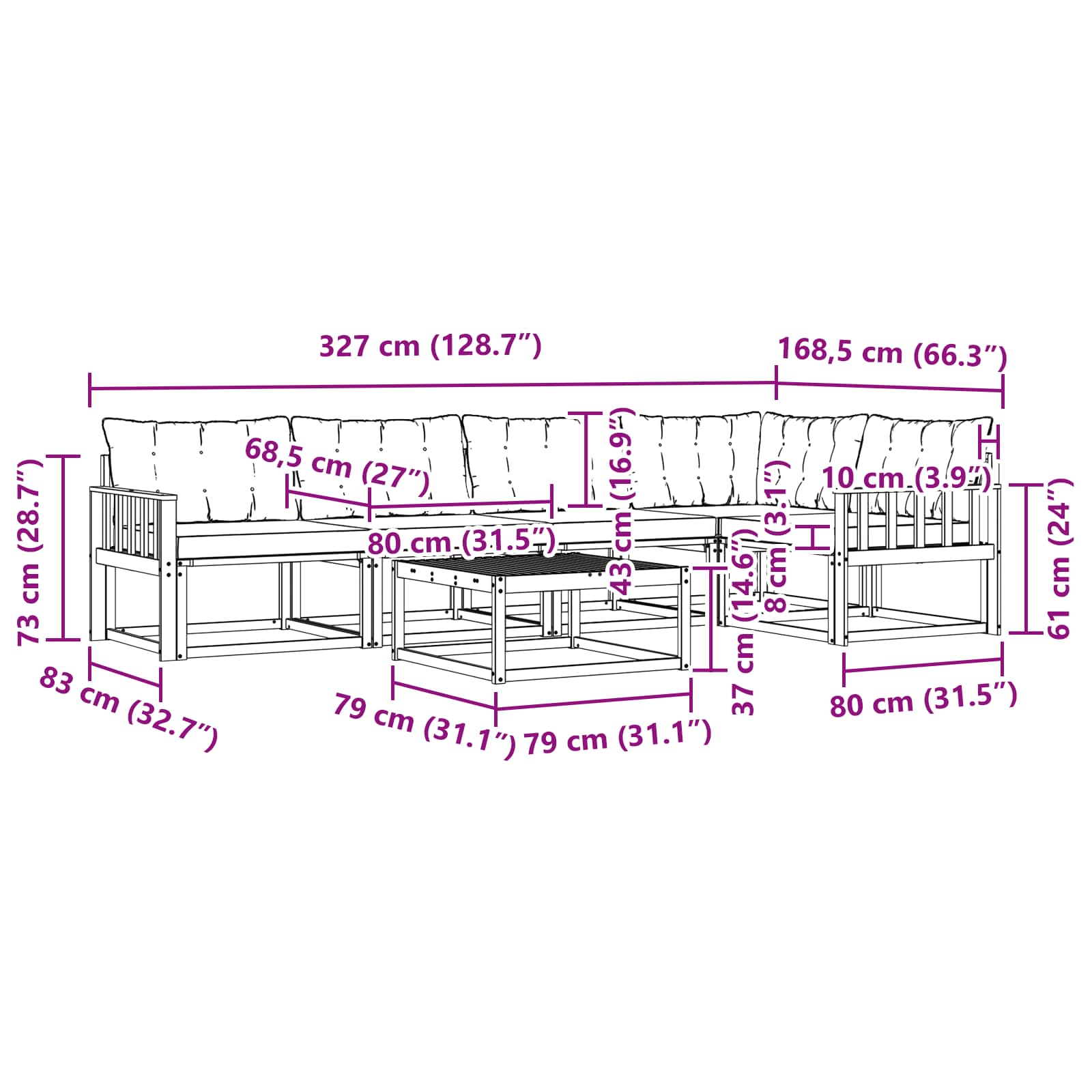 - 6 x Pernă de spate: 80 x 43 x 10 cm (LxWxH)