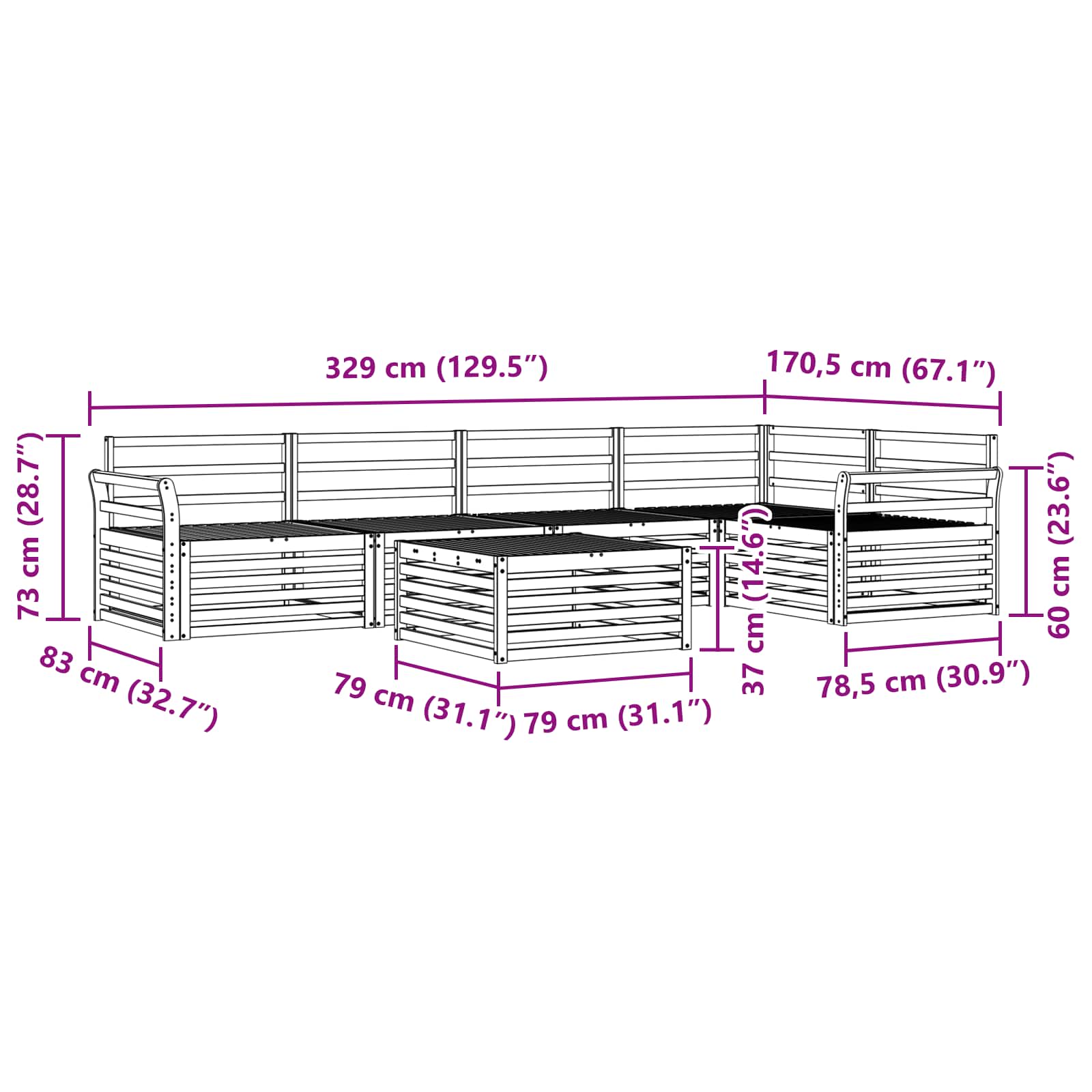 - 4 x Canapea de mijloc: 79 x 83 x 73 cm (LxWxH)