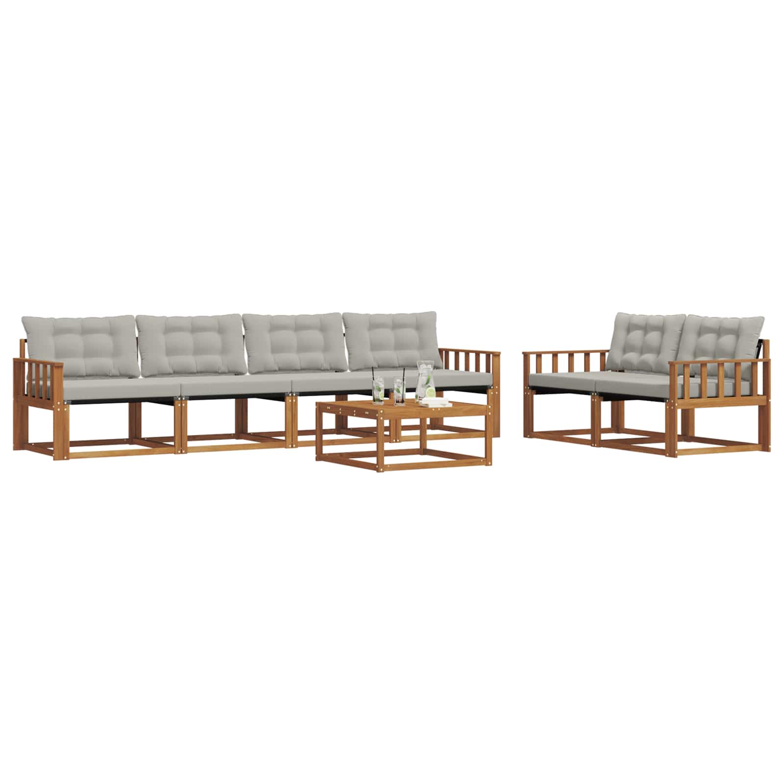 Acest set de mobilier de exterior îmbină stilul cu funcționalitatea, creând un punct de atracție pentru orice grădină sau terasă. Designul modern, cu linii simple și detalii discrete, adaugă eleganță și susține relaxarea și întâlnirile sociale afară. Fabricat din lemn masiv de acacia, setul promite durabilitate și un aspect plăcut, fiind alegerea perfectă pentru cei care caută atât practicitate, cât și un design rafinat în mobilierul de exterior.