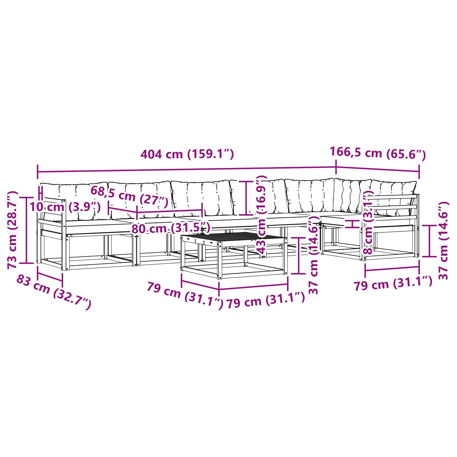 - 7 x Pernă de Spate: 80 x 43 x 10 cm (LxWxH)