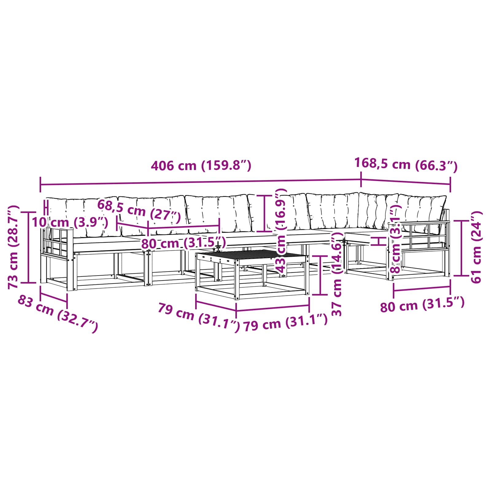 - 5 x Pernă de Șezut: 80 x 68,5 x 8 cm (LxWxH)