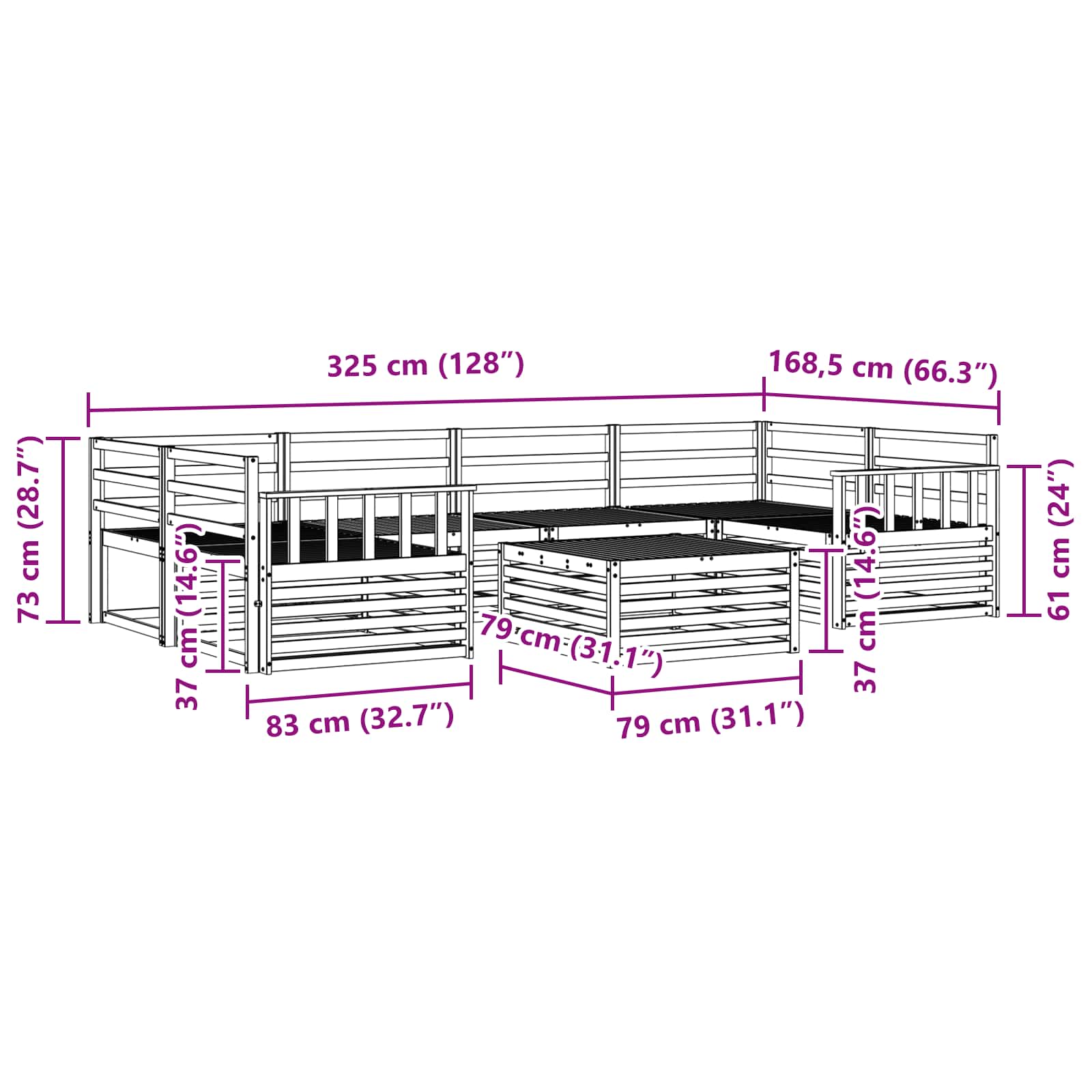 - 4 x Canapea din mijloc: 79 x 83 x 73 cm (LxWxH),2 x Canapea de colț: 83 x 83 x 73 cm (LxWxH)