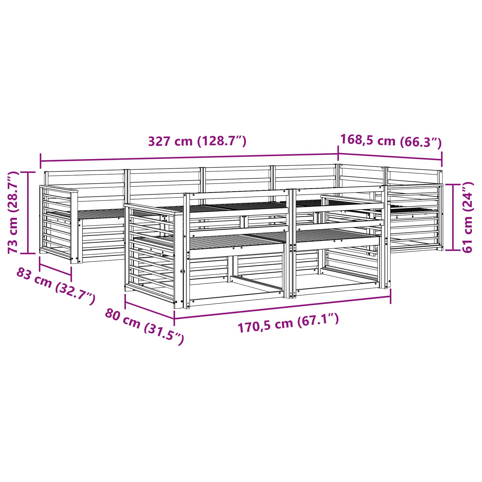- Dimensiuni generale: 327 x 168,5 x 73 cm (L x l x î)