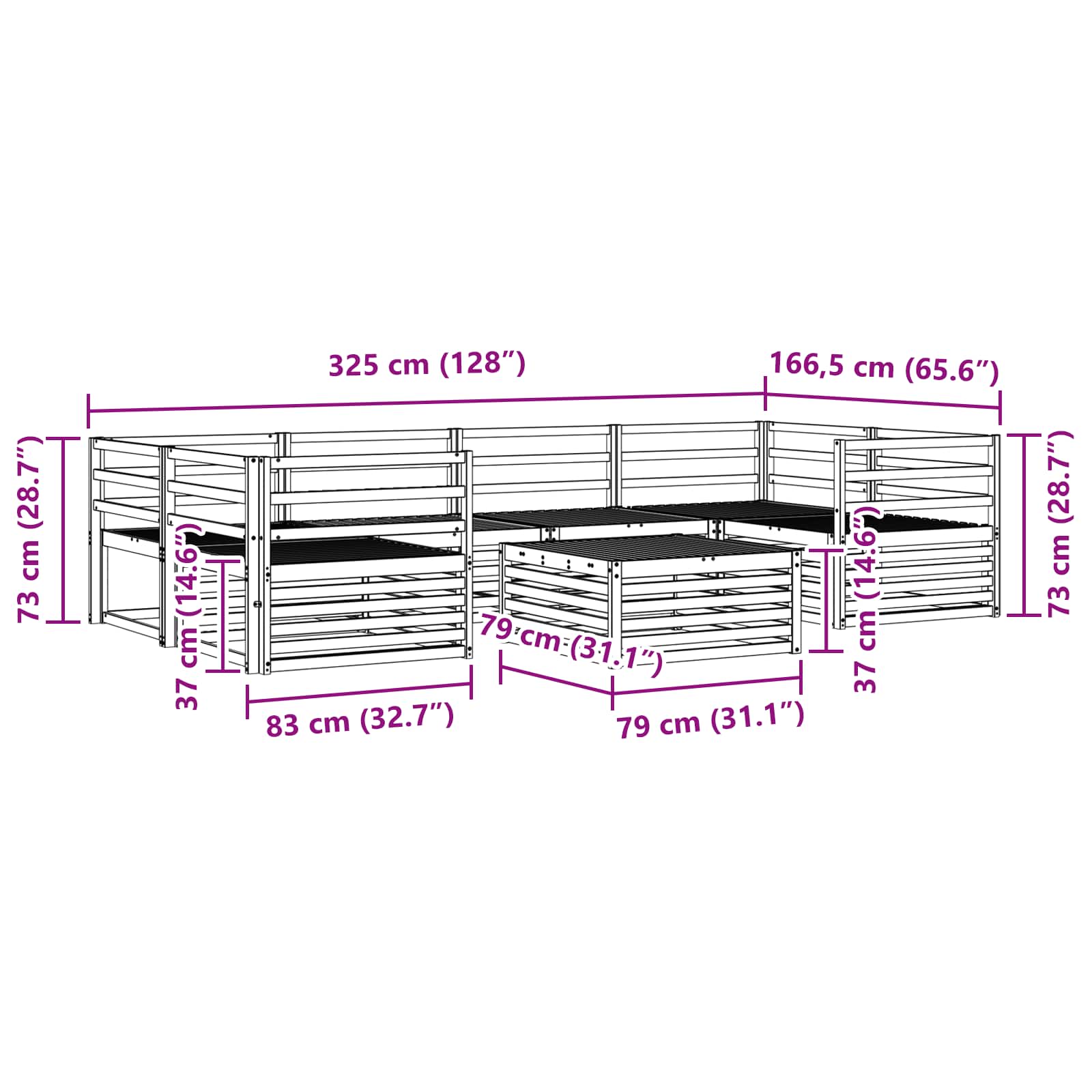 - 4 x Canapea din mijloc: 79 x 83 x 73 cm (LxWxH),2 x Canapea de colț: 83 x 83 x 73 cm (LxWxH)