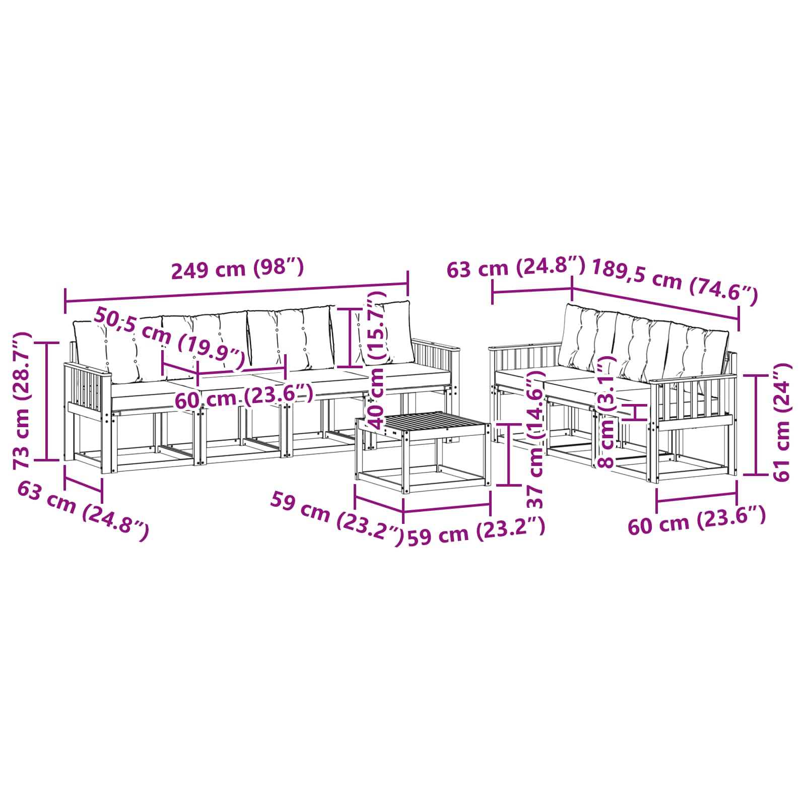 - 7 x Canapea mijlocie: 59 x 63 x 73 cm (LxWxH)