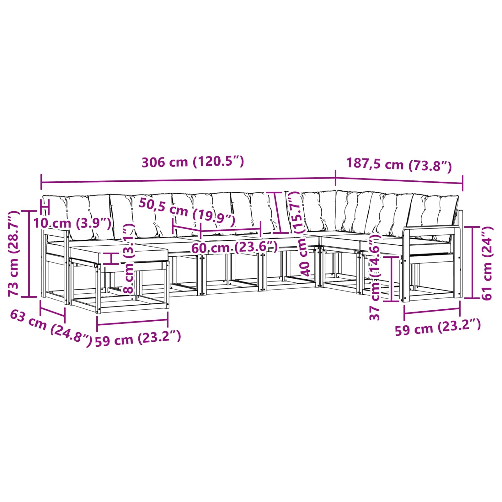 - 6 x Canapea centrală: 59 x 63 x 73 cm (LxWxH)
