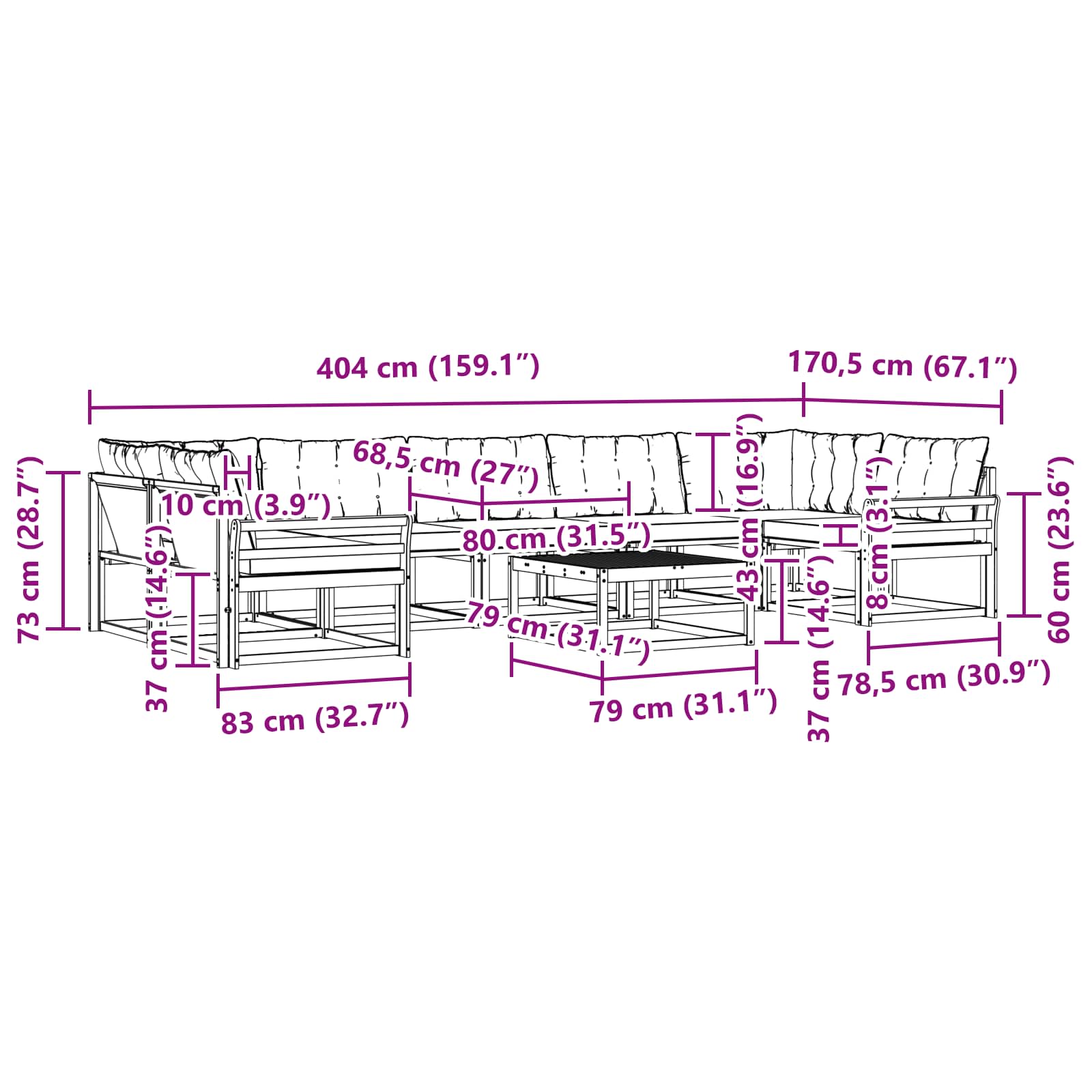 - 5 x Canapea de mijloc: 79 x 83 x 73 cm (LxWxH)