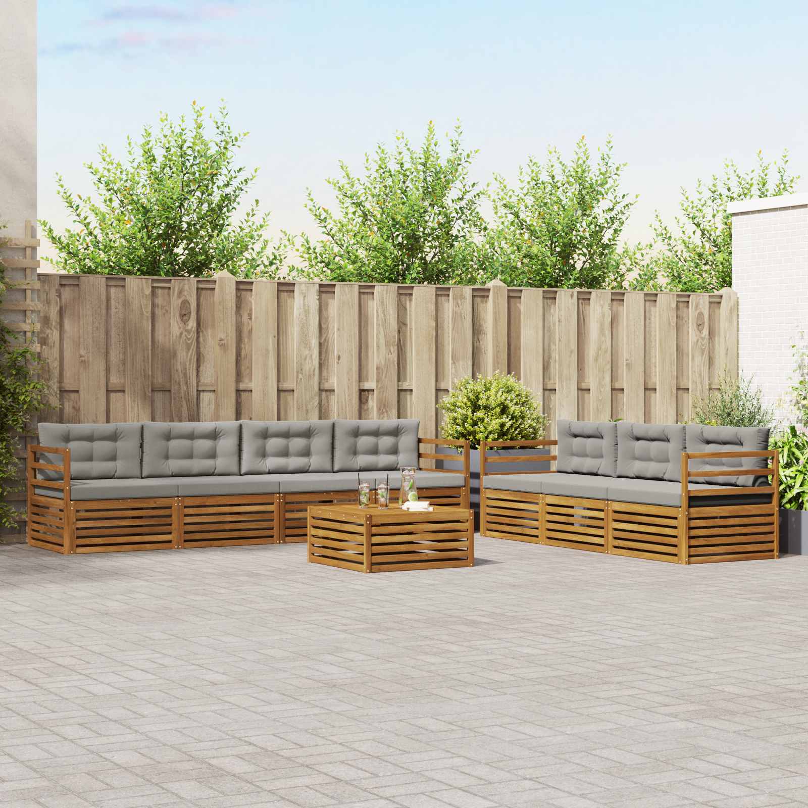 Setul de mobilier pentru exterior îmbină stilul cu funcționalitatea, creând un punct de atracție bine definit pentru grădină sau terasă. Designul său modern, cu linii clare și detalii simple, adaugă eleganță, sprijinind momentele de relaxare și întâlnirile cu prietenii. E fabricat din lemn masiv de acacia, ceea ce asigură durabilitate și un aspect frumos pe termen lung — alegerea perfectă pentru cei care caută practicitate și un design stilat.