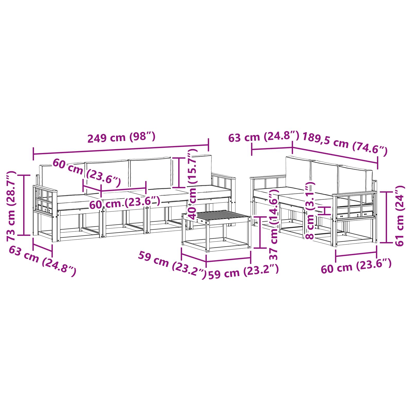 - 7 x Canapea Medie: 59 x 63 x 73 cm (L x l x H)