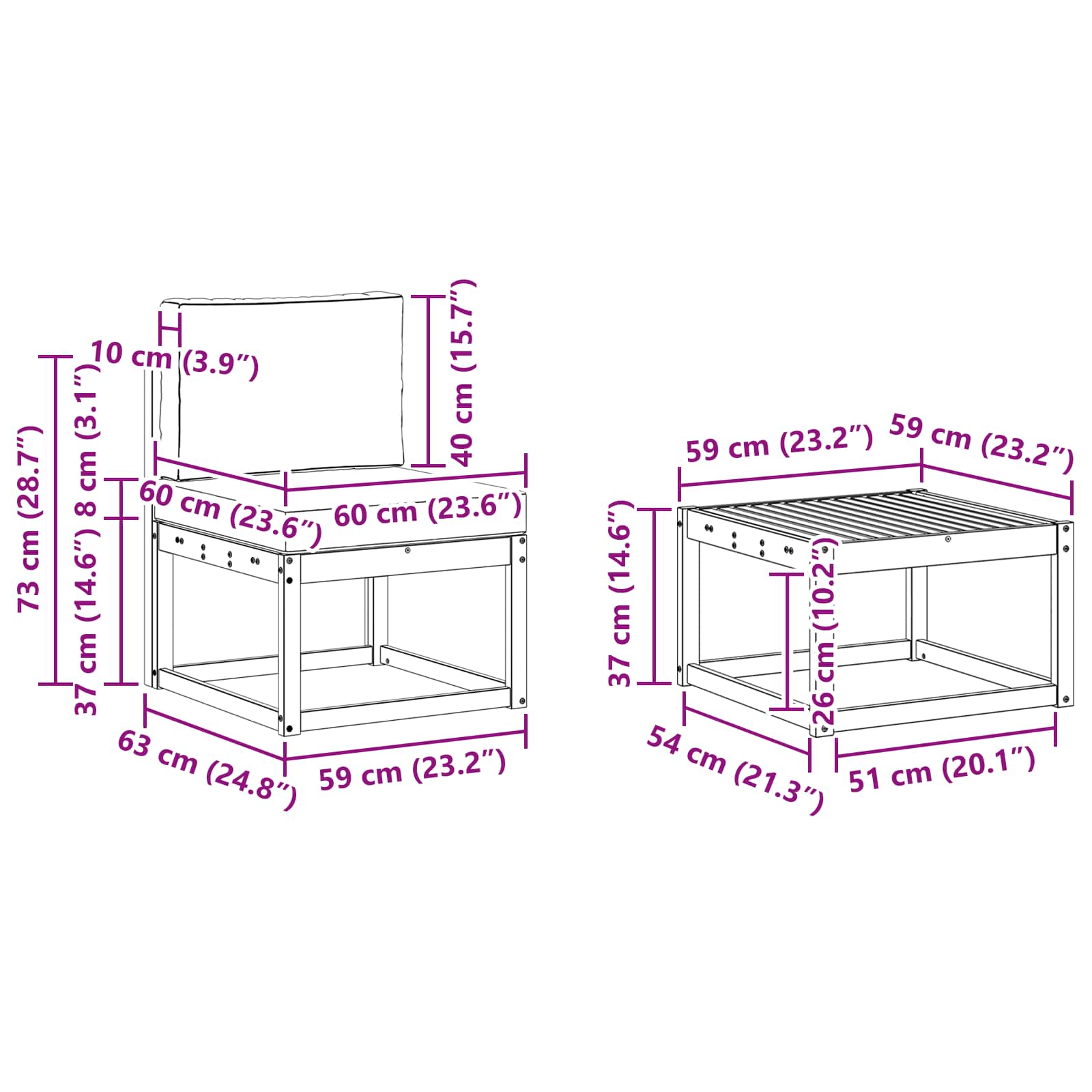 - 7 x Canapea Medie: 59 x 63 x 73 cm (L x l x H)