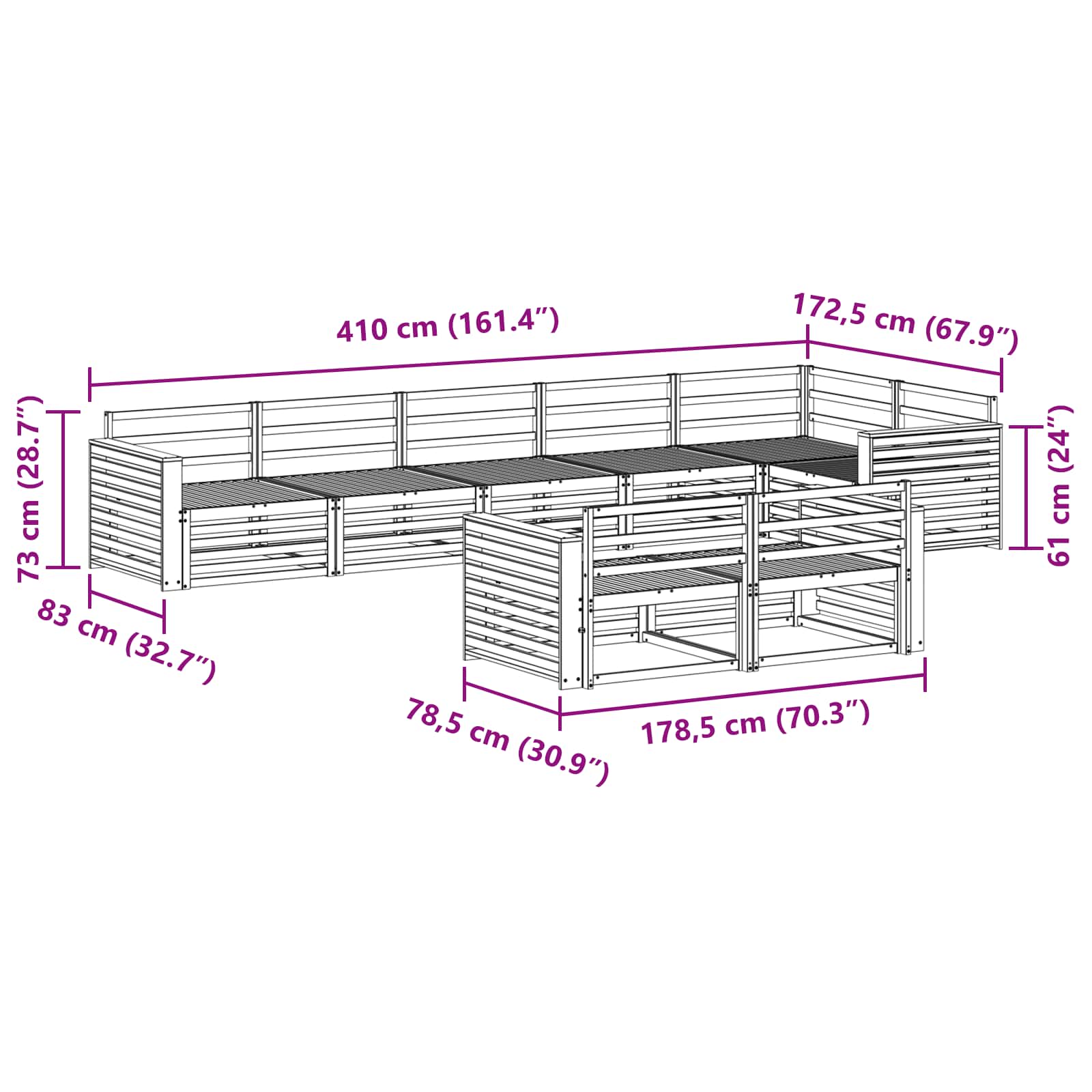 - Sofa de mijloc: 79 x 83 x 73 cm (L l x l x h)