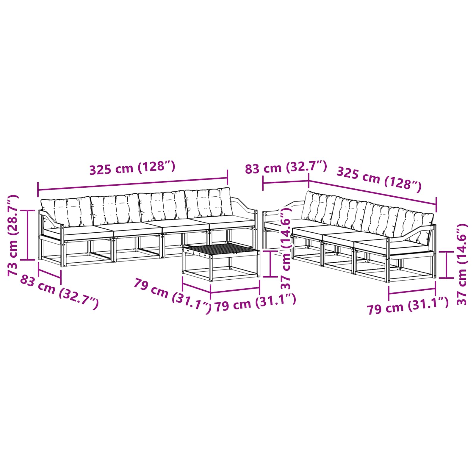 - 8 x Canapea din mijloc: 79 x 83 x 73 cm (LxWxH)