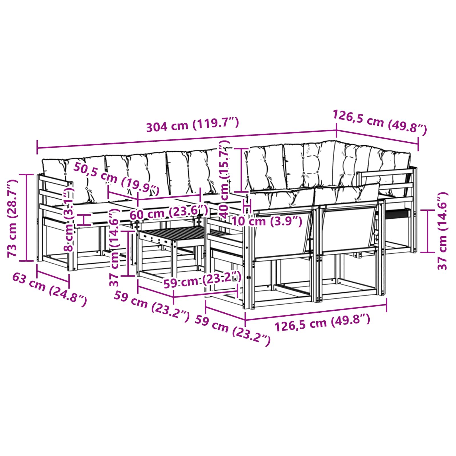 - 7 x Sofa medie: 59 x 63 x 73 cm (LxWxH)