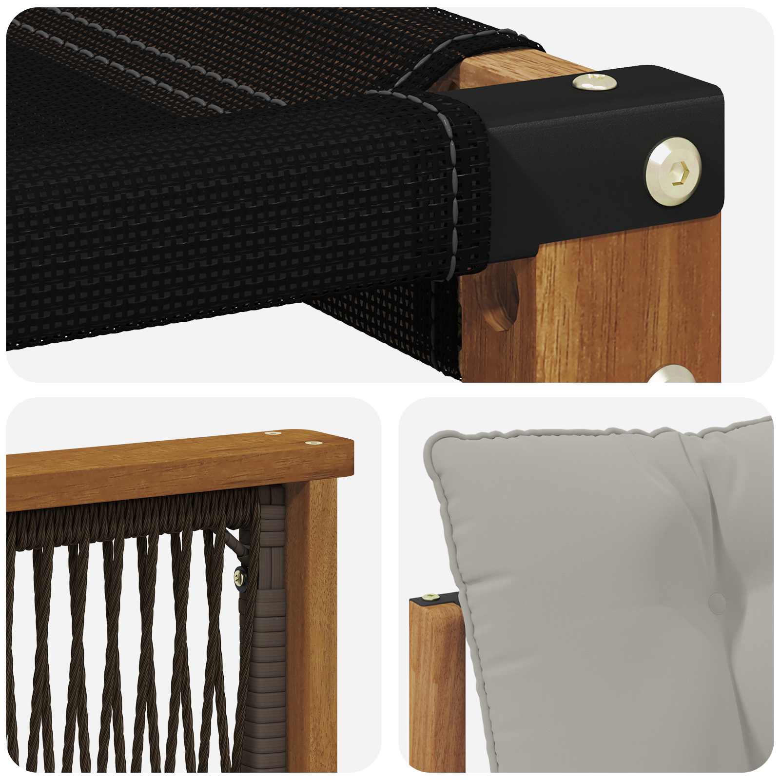 • Materiale: Cadru din lemn masiv de acacia, oferind nu doar frumusețe, ci și durabilitate. Are o textură naturală care adaugă la aspectul său și rezistă la vreme. Textilena din șezut și spate e confortabilă, nu se decolorează și e perfectă pentru soare și vreme variată.