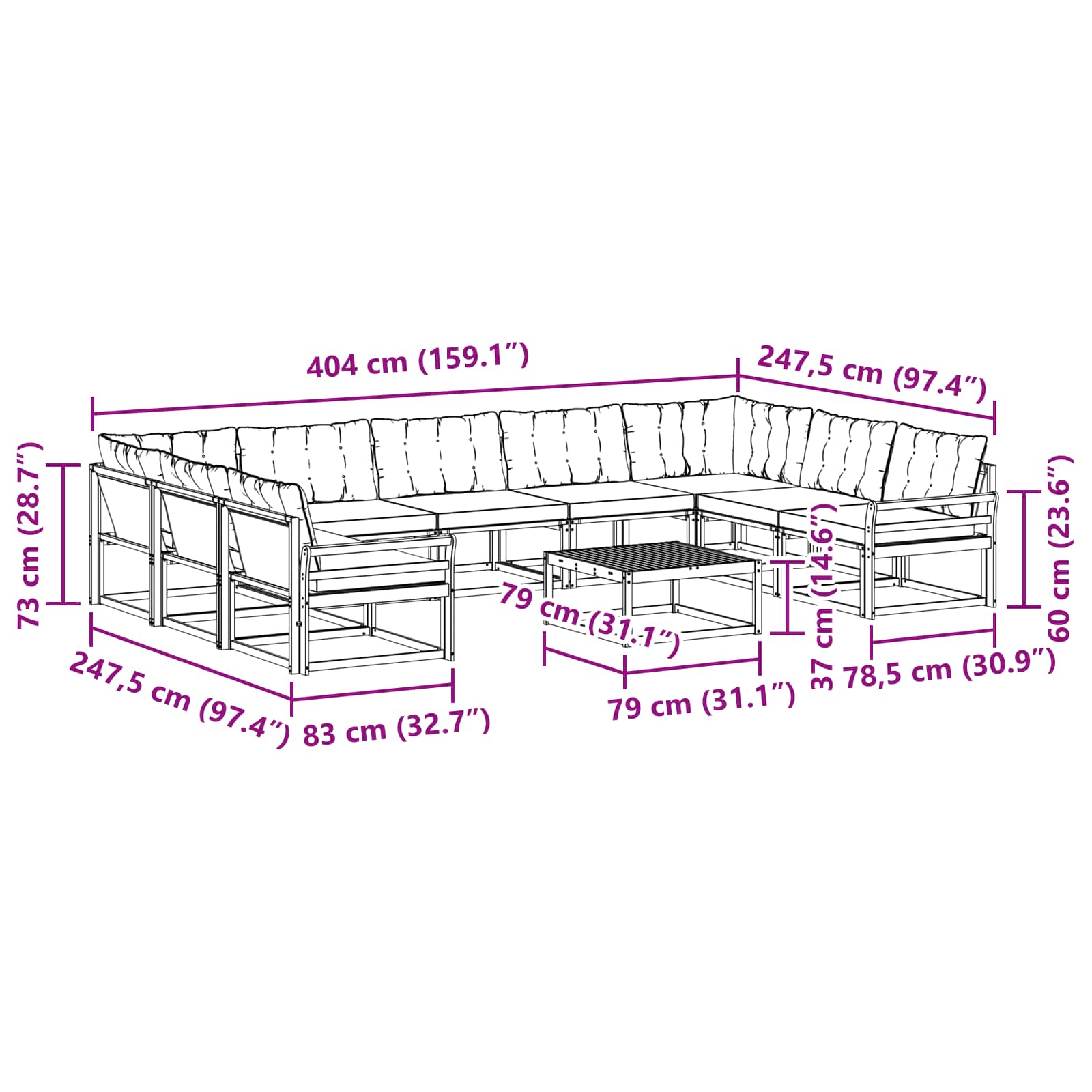 - 7 x Canapea medie: 79 x 83 x 73 cm (LxWxH)