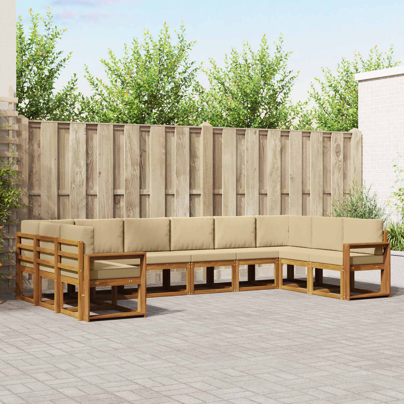 Setul ăsta de canapele secționale pentru exterior are un vibe modern, ideal pentru terasa sau grădina ta. Are un design elegant, simplu și foarte funcțional. E realizat cu grijă din lemn solid de acacia, iar cadrul său stylish e decorat cu detalii la spătar și tonuri calde de maro care se potrivesc perfect în aer liber. E gândit pentru confort și flexibilitate, oferindu-ți un loc cozy pentru relaxare sau pentru a-ți aduna invitații. Profită de aer liber, admiră priveliștea piscinei sau creează-ți un refugiu cozy în grădină cu acest set adaptable.