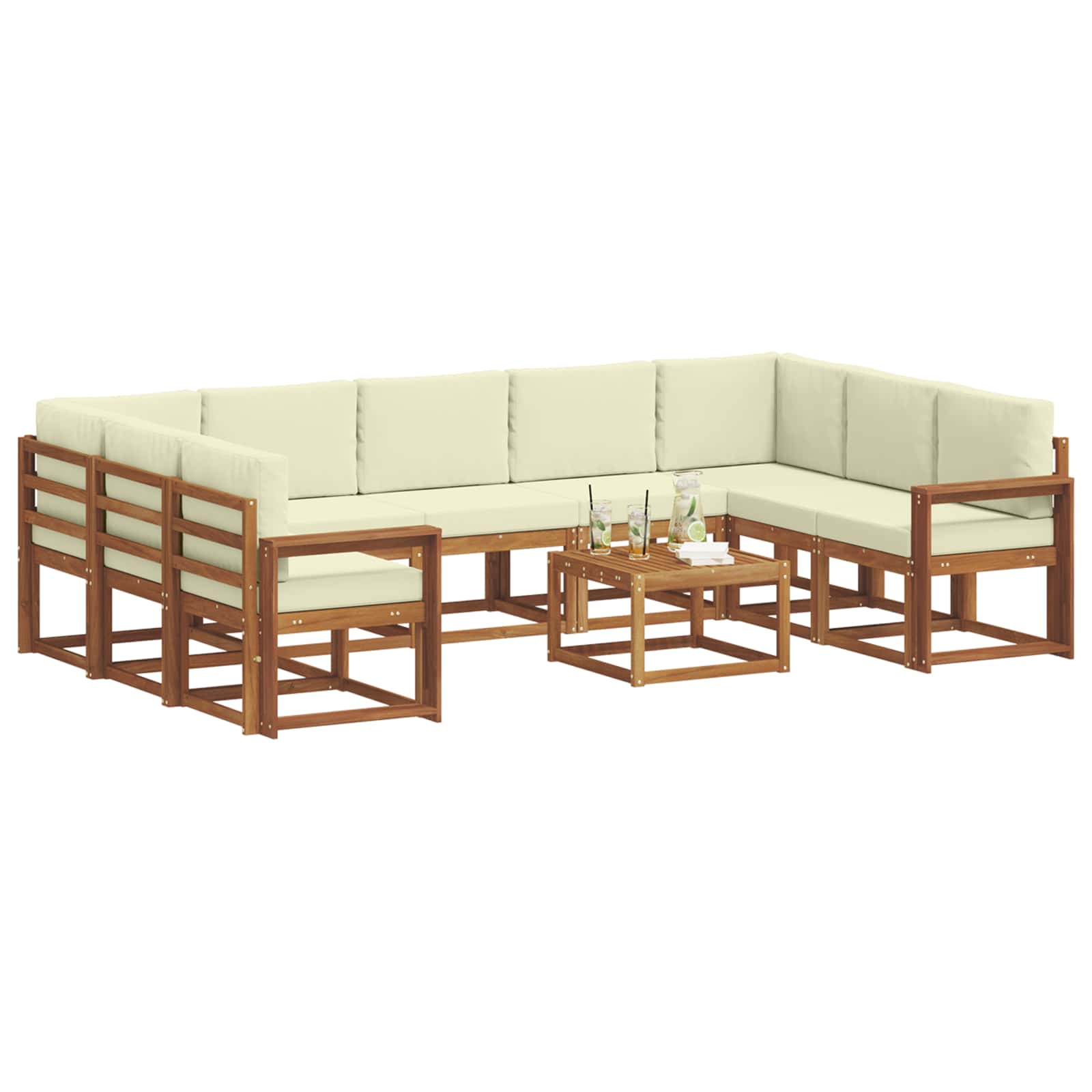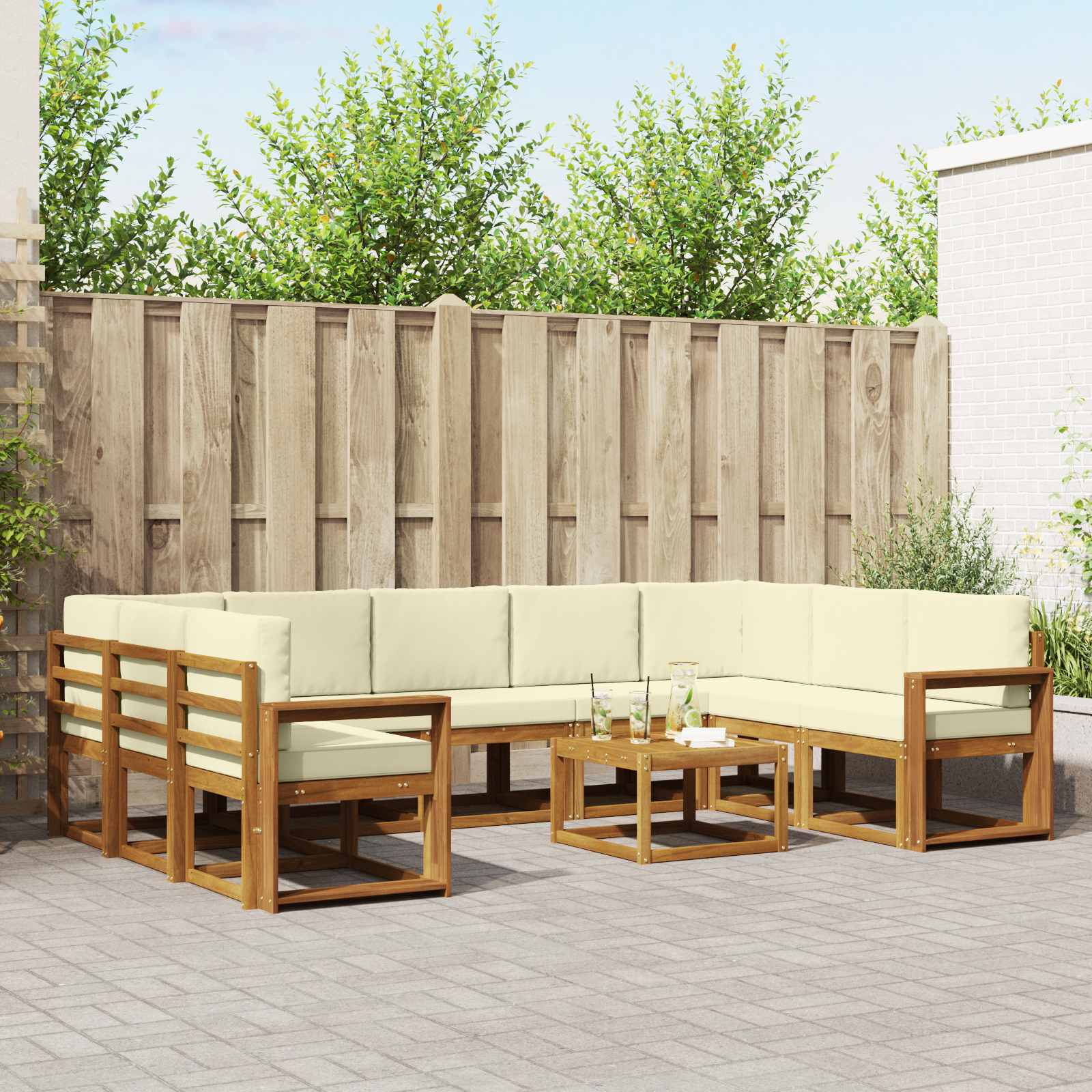 Setul ăsta de canapele sectional pentru exterior e gândit să combine confortul cu un look modern, fiind locul ideal pentru grădină, terasă sau lângă piscină. E construit din lemn de acacia solid, aducând un aspect curat și minimalist. E perfect pentru întâlniri intime sau petreceri mari, dându-ți libertatea să-l aranjezi cum vrei, în funcție de ocazie. Culoarea caldă a lemnului se îmbină ușor cu natura, adăugând un aer elegant oricărei curți.