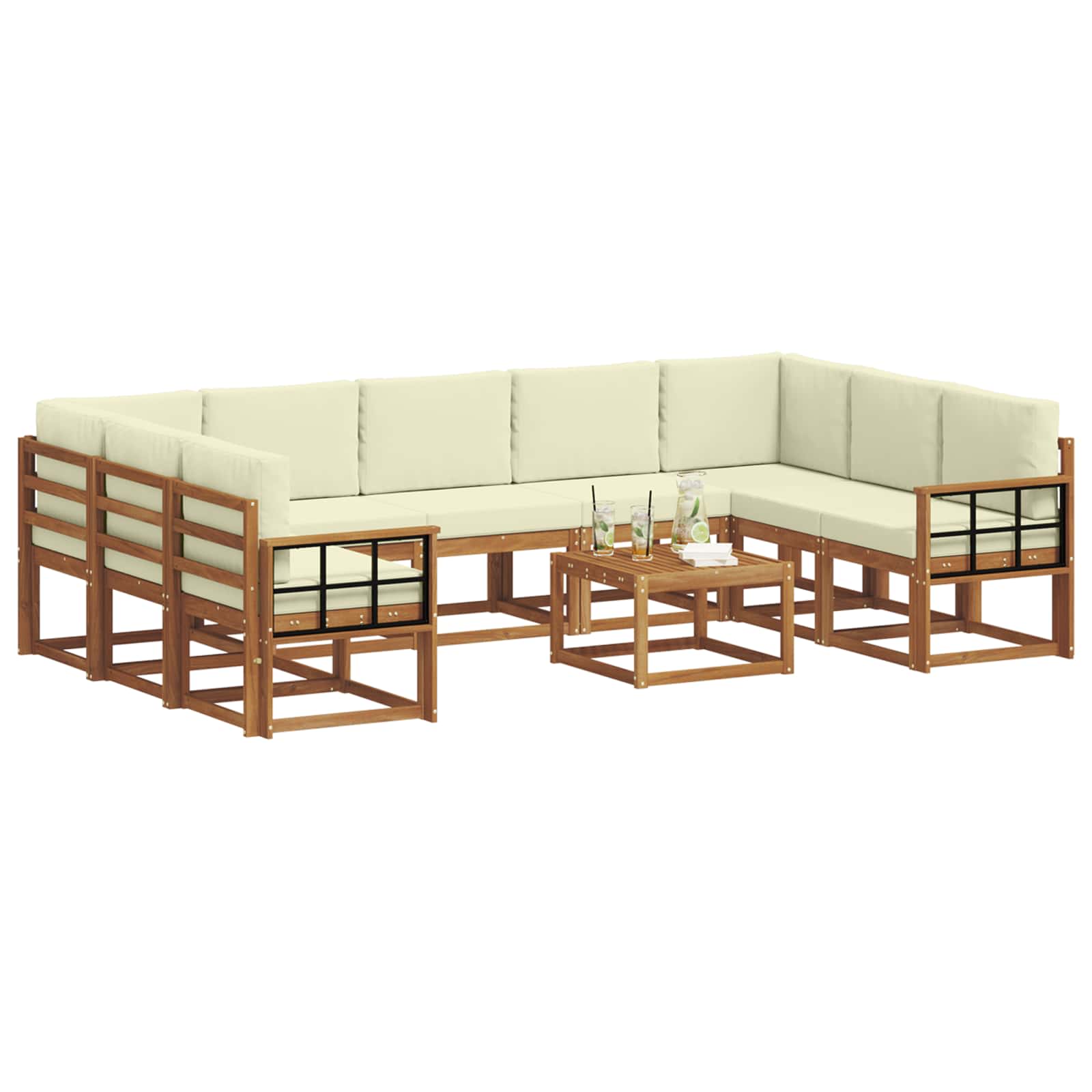Setul ăsta de canapele sectional pentru exterior e gândit să combine confortul cu un look modern, fiind locul ideal pentru grădină, terasă sau lângă piscină. E construit din lemn de acacia solid, aducând un aspect curat și minimalist. E perfect pentru întâlniri intime sau petreceri mari, dându-ți libertatea să-l aranjezi cum vrei, în funcție de ocazie. Culoarea caldă a lemnului se îmbină ușor cu natura, adăugând un aer elegant oricărei curți.