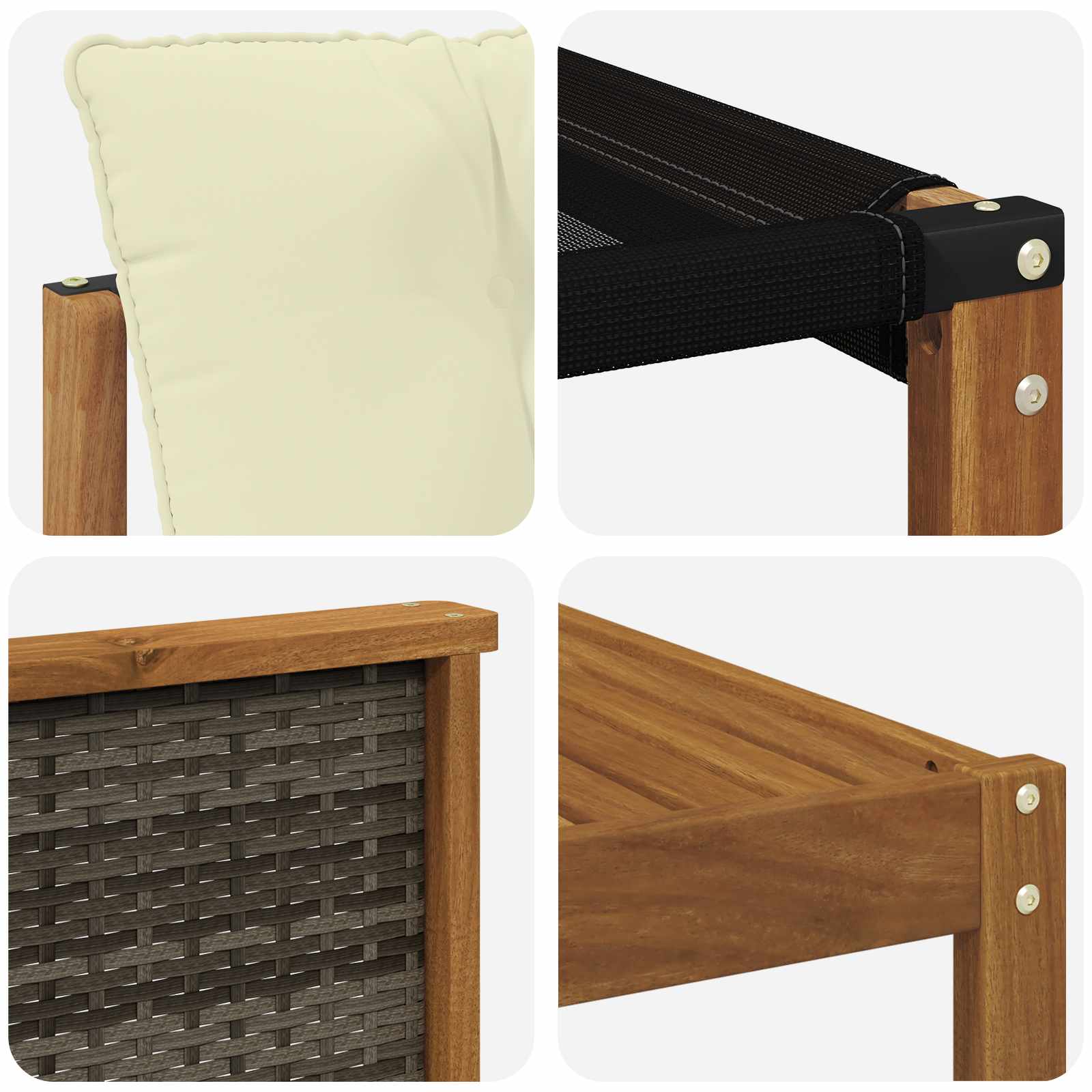 - Funcționalitate brațe: Bratele din lemn de acacia oferă suport pe care te poți baza, făcând setul mai comod.