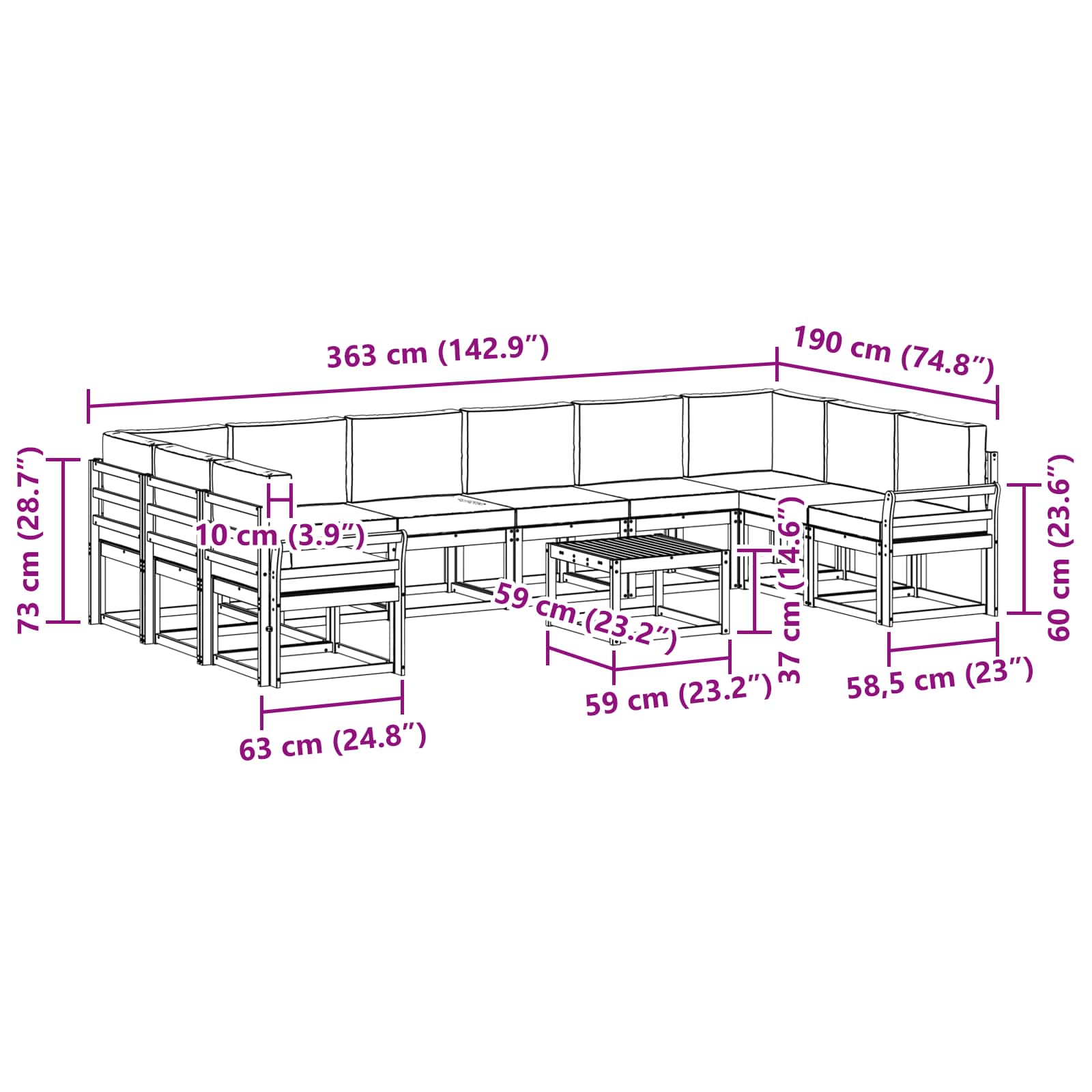 - 8 x Canapea Mijloc: 59 x 63 x 73 cm (L x l x h)