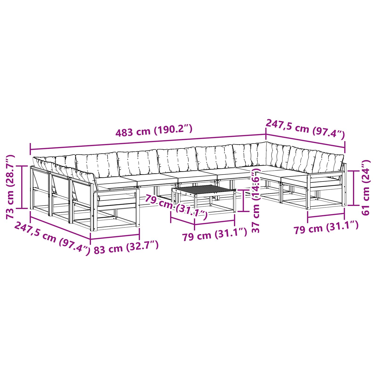 - 8 x Sofă mijlocie: 79 x 83 x 73 cm (LxWxH)