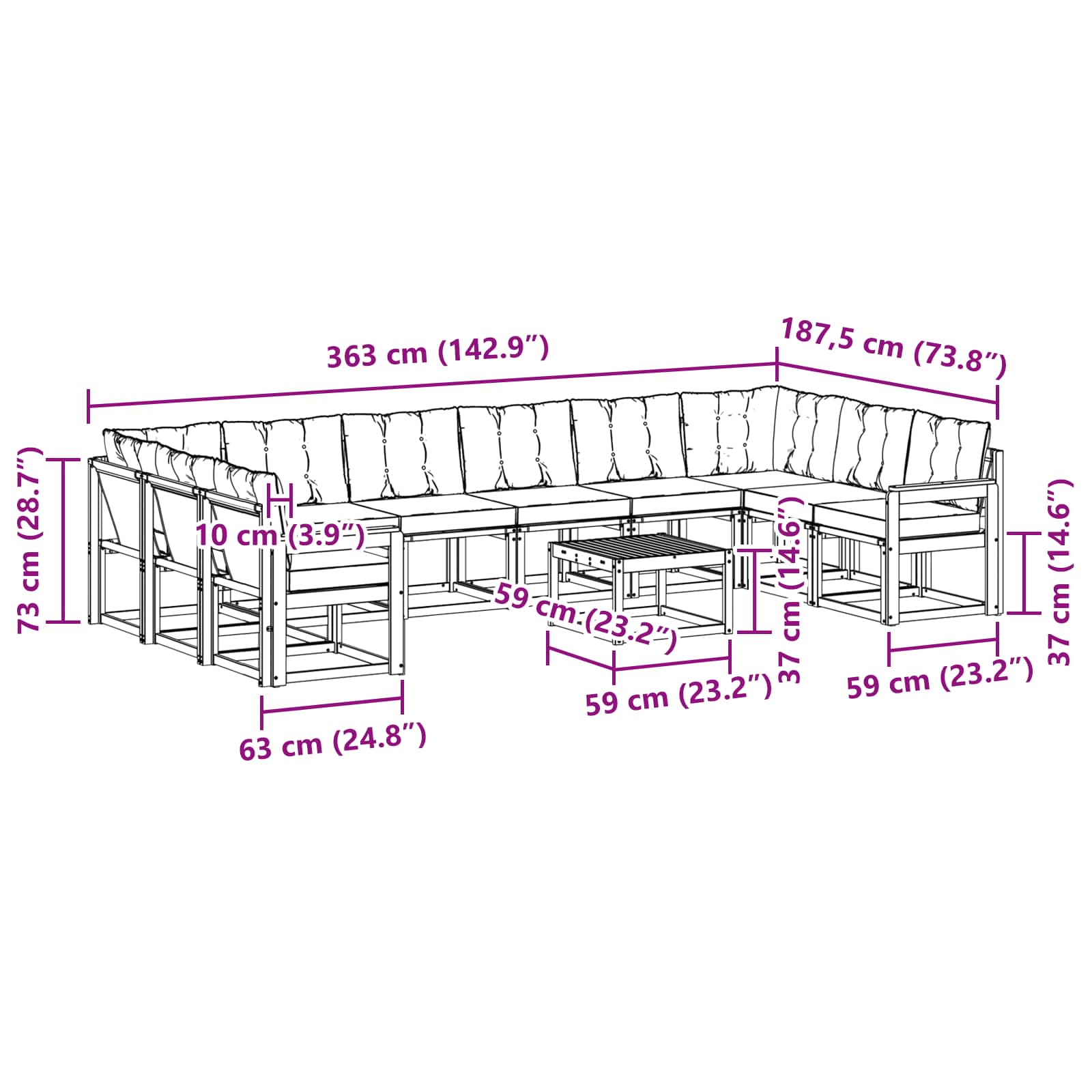 - 8 x Canapea Medie: 59 x 63 x 73 cm (L x l x h)