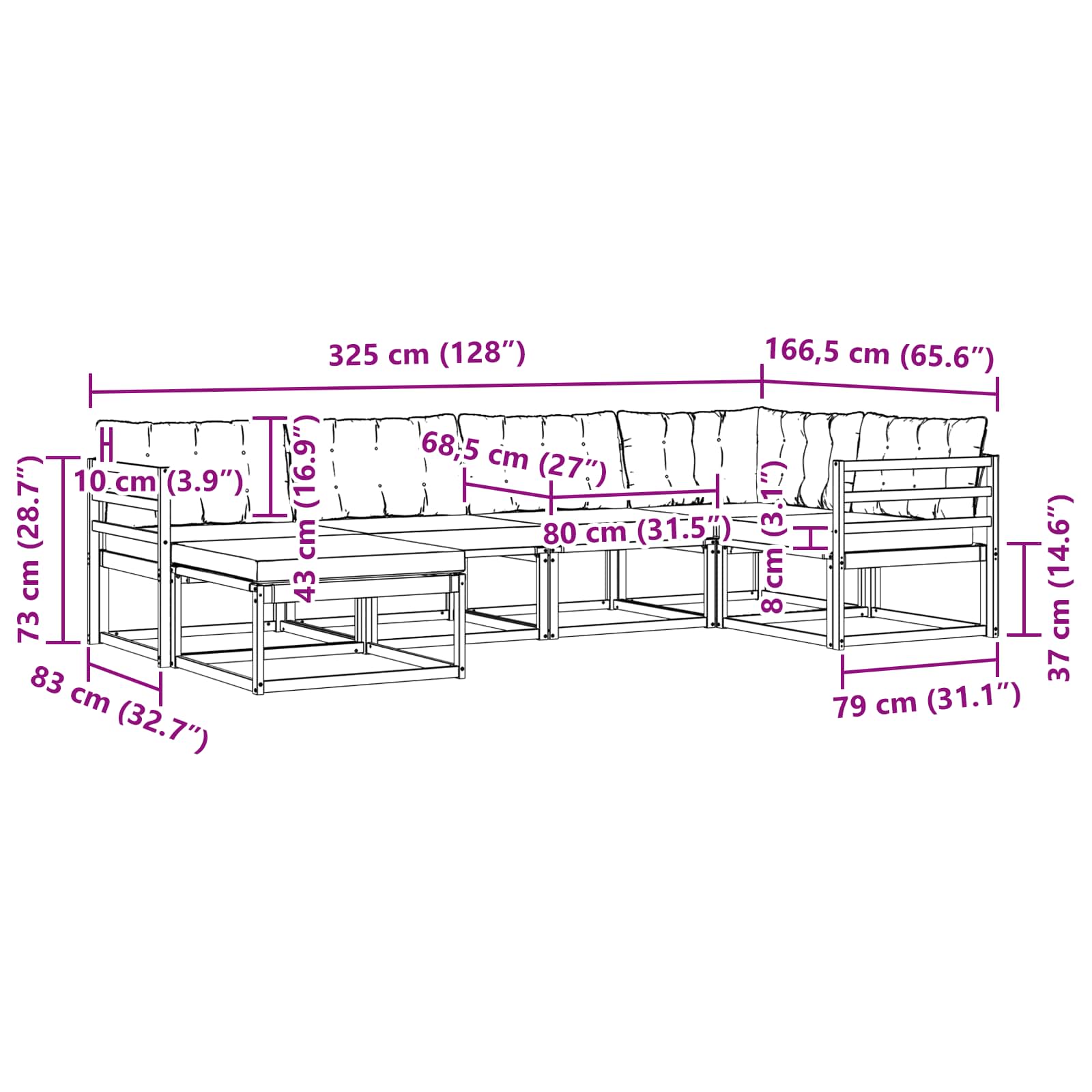 - 6 x Pernă de spate: 80 x 43 x 10 cm (LxWxH)
