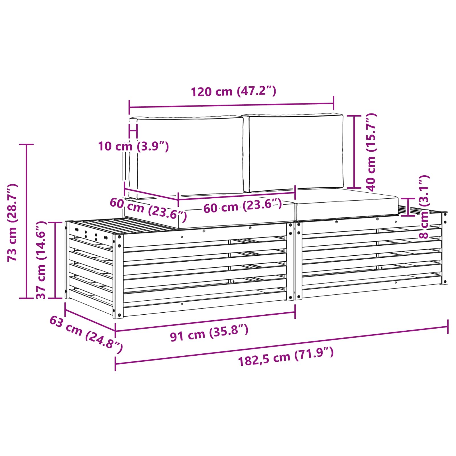 - 2 x Perne pentru șezut: 60 x 60 x 8 cm (LxWxH)