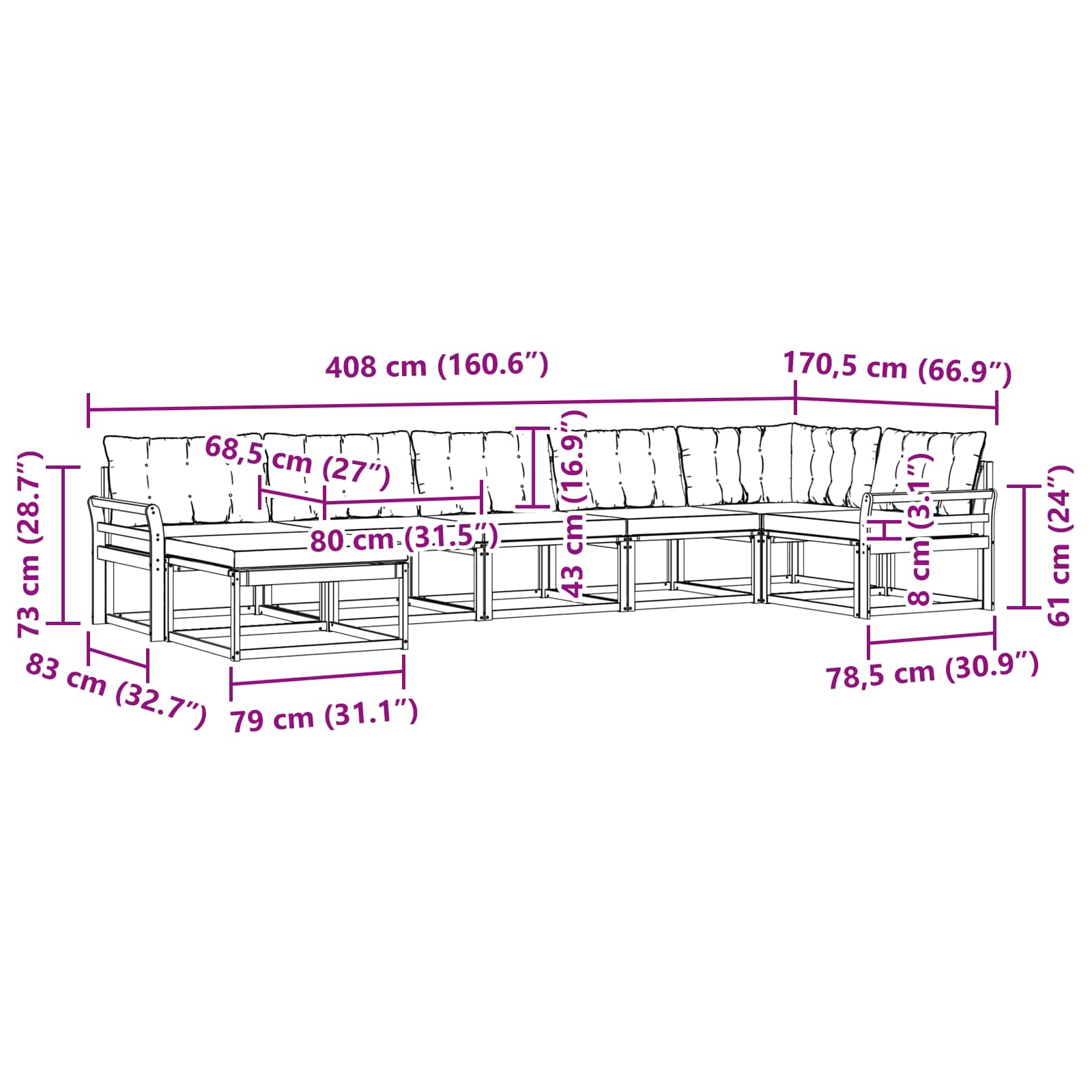 - 7 x Pernă de spate: 80 x 43 x 10 cm (LxWxH)