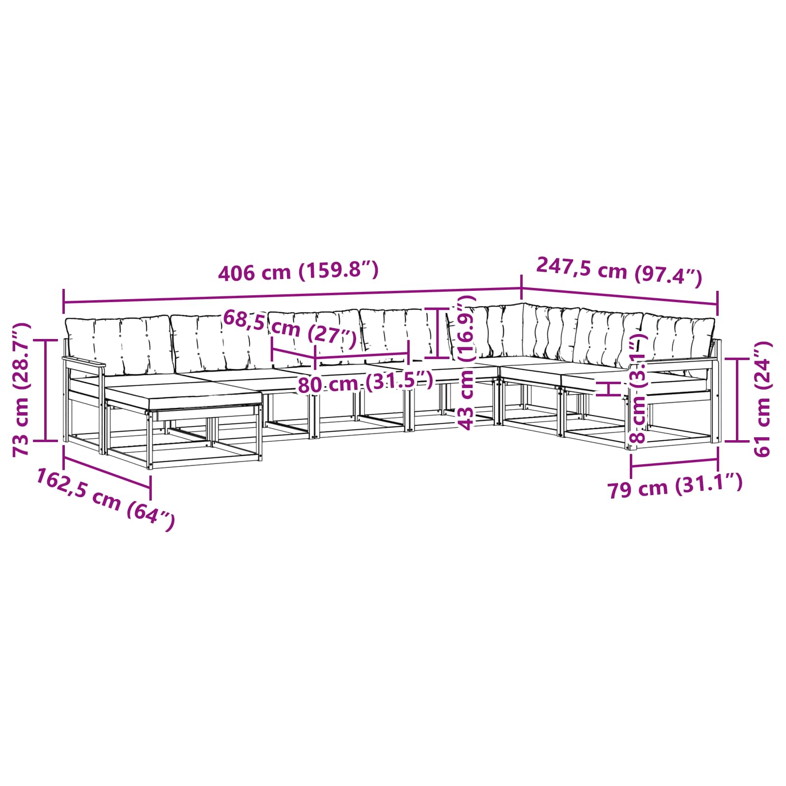 - 6 x Perne de șezut: 80 x 68,5 x 8 cm (LxWxH)