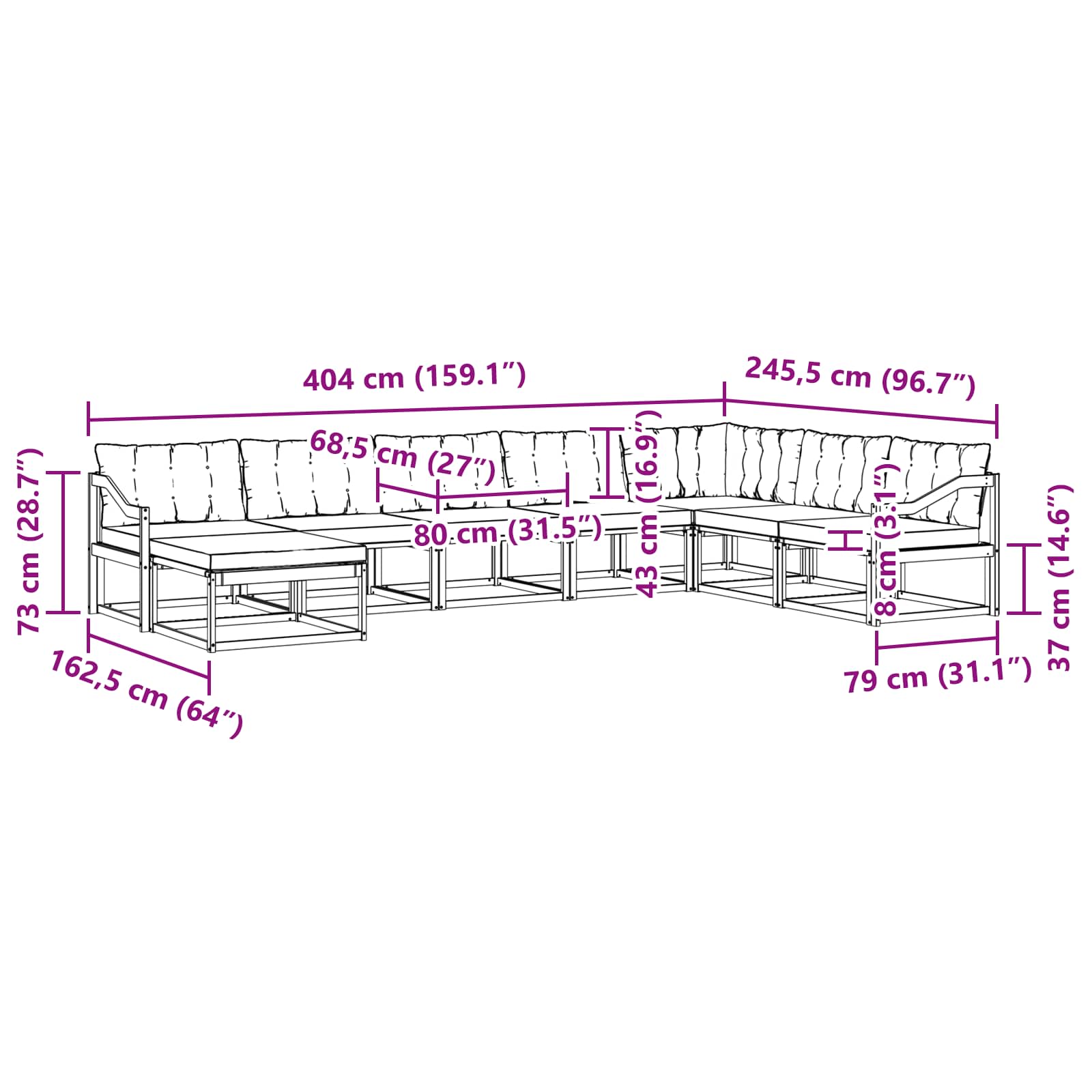 - 6 x Perna de Șezut: 80 x 68,5 x 8 cm (LxWxH)