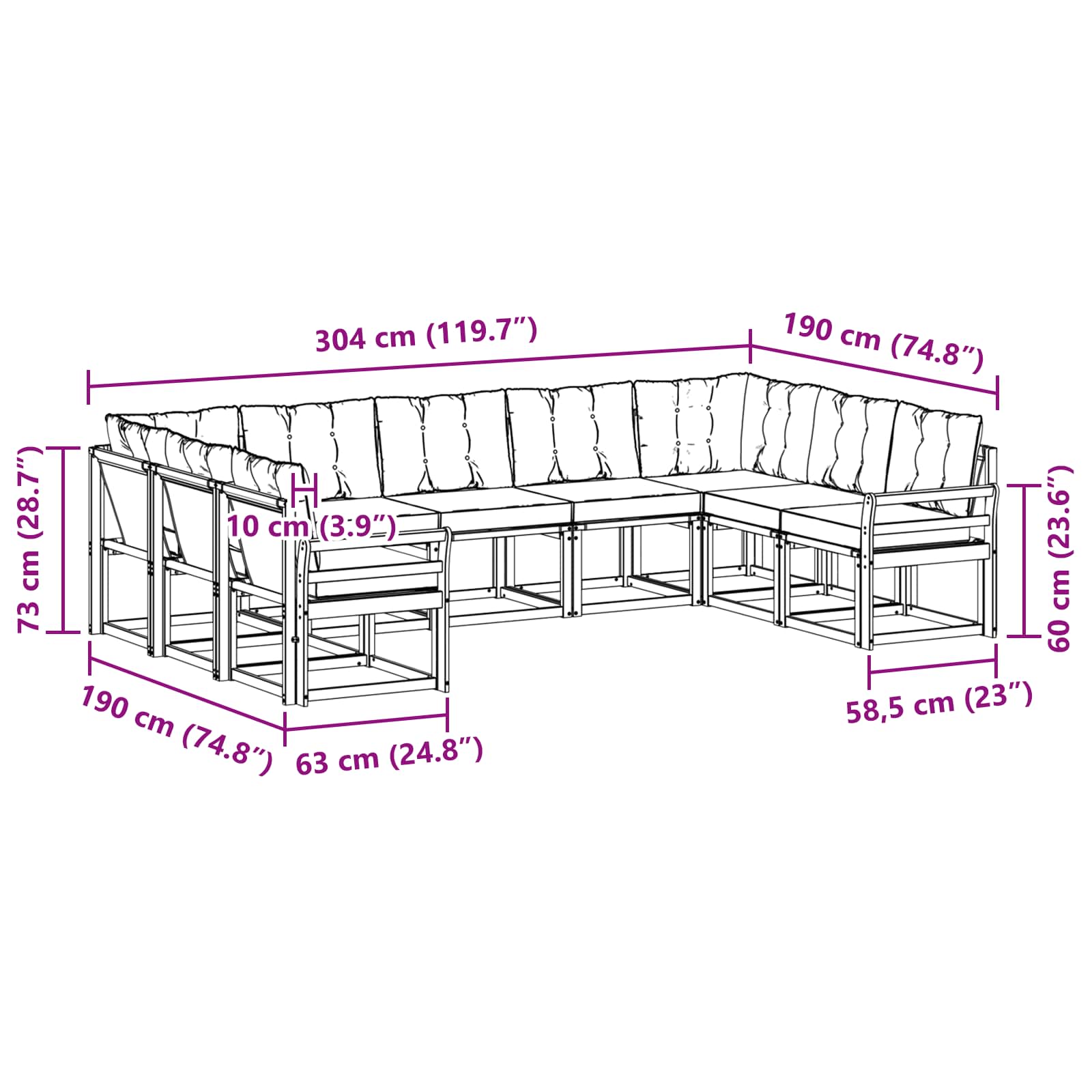 - 7 x Canapea de mijloc: 59 x 63 x 73 cm (LxWxH)